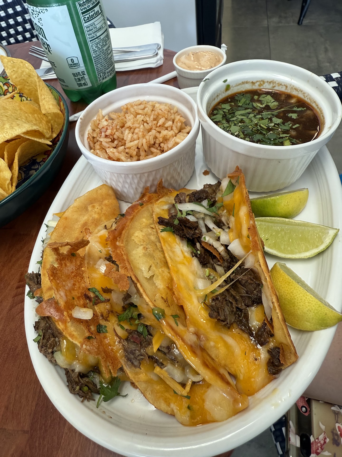 Itās been a while since Iāve been meaning to try out this new local taco spot. I came in on a Sunday and ordered 3 birria and one chorizo and potato taco. I ordered to go so my partner and I could sit out on the beach while giving it a try. Chips and salsa were free and the birria came with a side of rice that I have to say was delicious. The birria is my wifeās favorite and so she was the real reviewer, she gives them a 8/10 which is solid. The consume she gives a 10 and I can agree it was soo flavorful! Iād give the overall experience and food an 8.5/10. The service was quick and the food was good. Only thing I will say is that if youāre interested in trying different types of tacos youāre only allowed to purchase 3 of the same, only exception is to add one to your plate (hence the one chorizo and potato taco). Which I hope in the future will change....