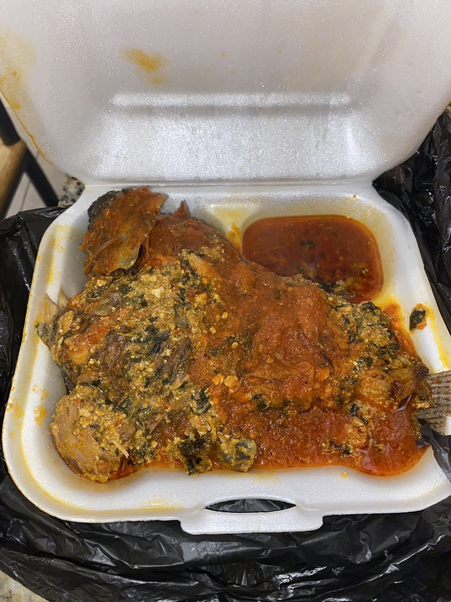 Thorough Review: I arrived at the location and the place had an unpleasant sent and was dark and gloomy. They were selling clothes in the front. And the restaurant was in the rear. I was not greeted at all. The woman ignored me initially. Being used to poor service and patient. I waited because I wanted to try the food. Being a soup I expected $12 price, they lady quickly and lowly said $24.00. She was not thrilled about the price as well. I was shoked! I was like how much for soup and fufu!!! I was not happy. But I already ordered it, so I took it with me. Hoping it was going to be good. BAD MISTAKE. I had the egusi with poundo (FUFU). And it was the poorest quality of meat. And the FUFU was flavorless. It was a lunch portion. No drink included.