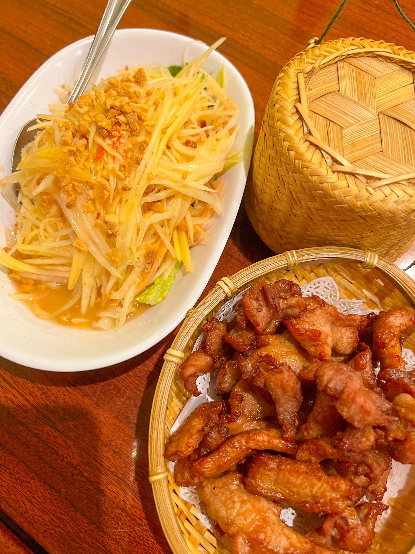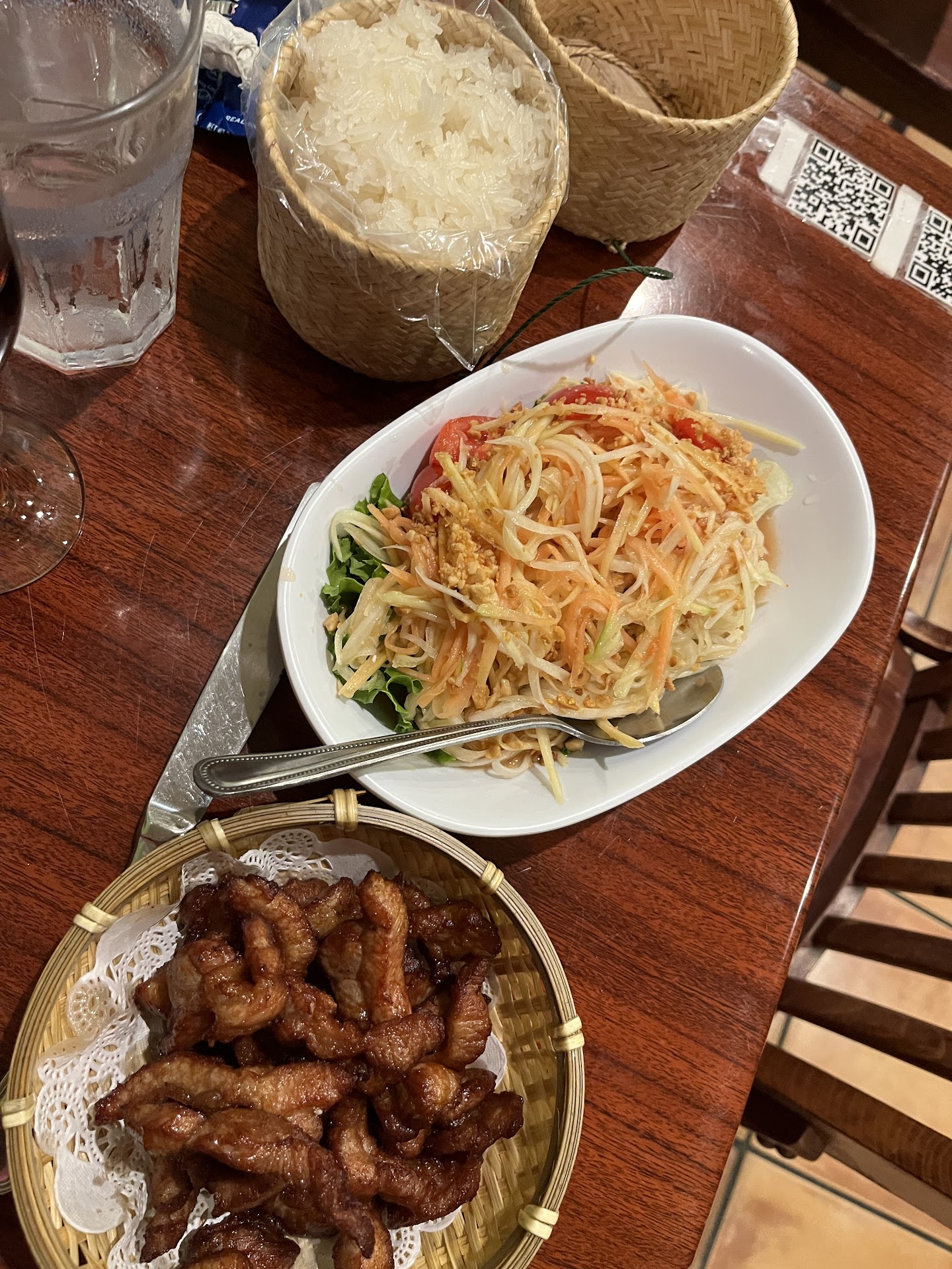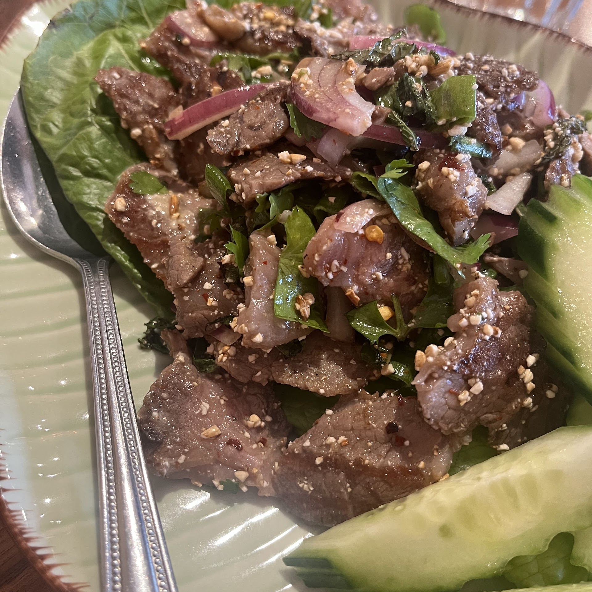 We ordered beef panang, pad woon sen and laarb with beef steak. Everything was full of flavor and with hearty portions. Family style sharing is recommended because of the amazing portions. I grew up with a blended family with Thai influneces, and this was very close to the dishes I've had growing up. If I could offer any feedback, it would be to make the Panang with a little more nutty taste, it was a little sweeter for my liking but still delicious. The pad wood sen was great, but would have liked lime wedges served with it to squeeze over it. For both dishes, I felt the protein was more "boiled" as it wasn't tender. If the meat was simmered in the curry or stir fried on a higher heat, the flavor and texture would make a huge difference.