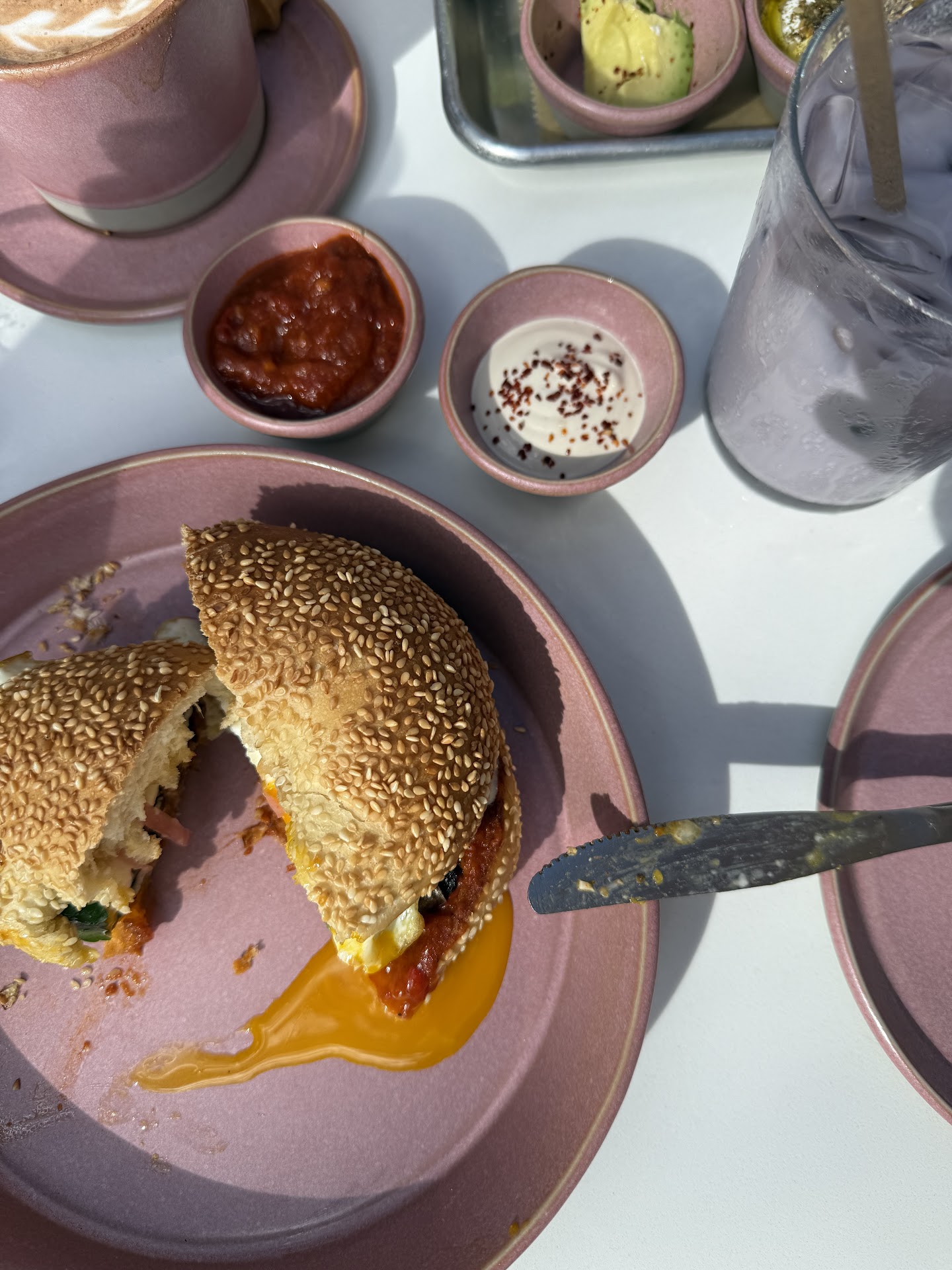 I got an iced lavender ube tea with oat milk and it wasnāt my taste at all, very synthetic and sweet but thats just my taste buds, very sorry for wasting my 7$. Then I had an eggplant & egg bagel which was very good! The sort of spicy tomatoey sauce was bomb. Other than that, just a plain sesame bagel with a sunny side up egg and some fried eggplant. Nothing that special, for the price of 17$, it was very overpriced.