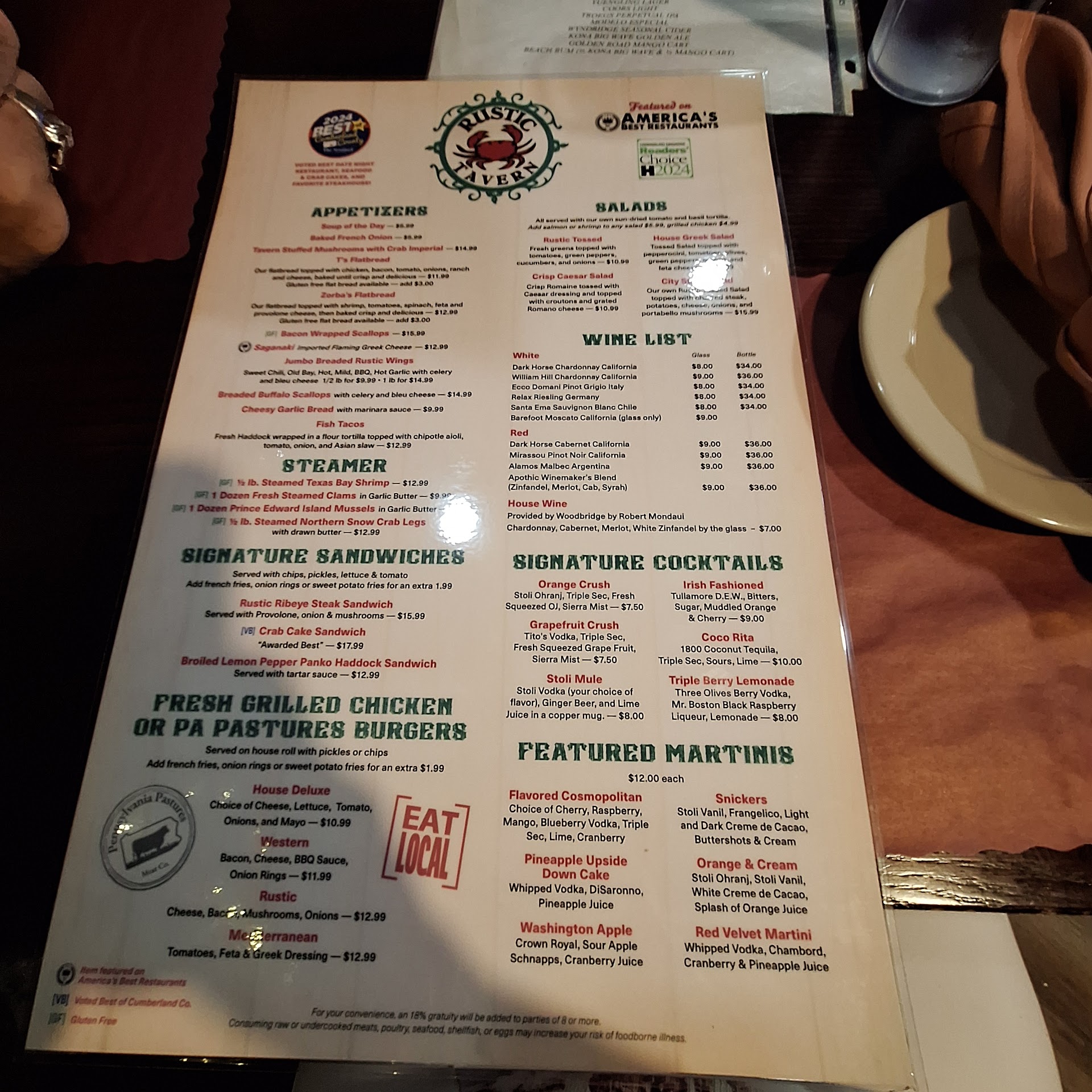 My husband and I donât go out to eat as much as we used to with the cost of everything being so way out of hand, however we decided to splurge a bit and treat ourselves to a special night. At least we were hoping to have a special night out which didnât turn out that way at all! We arrived at The Rustic Tavern around 3PM on Saturday, September 28, 2024. We were seated at a table for two as far back in the dining room as you could get, right under an air conditioning vent. The hallway to the restroom was right behind our table and my husbands' shoulder got bumped into by 3 diô°erent people heading to the restroom within the first 3 minutes we were sitting there. My husband went up to the hostess and requested to have another table because of how cold we both were. With an attitude, the hostess picked up our menus and water glasses and showed us to another table. Once again, we were seated at a table with an air conditioning vent directly above our heads and it was very cold, however, we decided to deal with it. When our server took our order, my husband asked for gravy on his fries to which the server replied âwe donât have gravyâ my husband said surprisingly, âoh, you donât have gravyâ? To which the server replied no, this isnât a diner! What did the server have against diners? It was as if they said why are you here, you should have gone to a diner. What an absolutely, unacceptable response from your employee. Is it customary for your employees to treat your customers in such a demeaning manner? Actually, I can most likely answer that question, because as time went on, our visit became even more upsetting. There were 3 separate parties of 2 who arrived shortly after we did. At this time, there were plenty of empty tables for 4 or 6 people, however the parties of 2 were put on a waiting list and directed, not asked, but directed, by your hostess to have a seat at the bar while they waited. I could see it on the faces of one of those couples, they were not ones who would feel comfortable âwaiting at the barâ and they should not have been told they had to do so. They opted to wait outside in the rain while again, I must mention there were plenty of vacant tables in the dining room. Another one of the parties of 2 who were added to the waiting list, was a couple on the elderly side, you could see the man had trouble standing. When he decided to take a seat at an empty table the hostess basically scolded him and told him he could not sit there because the table would be