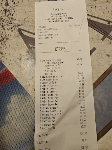 Read moreWhen I originally posted this review I was very, very generous. The Arby's in NOTH MYRTLE BEACH is without a doubt the worse Arby's I have ever had the displeasure of eating in. I routinely order a ruben sandwich at every Arby's I go to and this is the worst. There is at least 50% less corned beef on their sandwiches than I recieve at ALL other Arby's, like in Cockeysville. Md. or Shrewsbury, Pa. I know that the portions are weighed for quality control and uniformity, but some thing is seriously wrong at the NMB store. Is product being taken home by employees, or being with held to increase profits ? Not an accusation, but why so little meat? Why a sandwich so subpar to other Arby's? The center sploch of meat does not extent to the outer crust. Sadly, this is the third, but last time I will ever patronize this location. They have the meats, they just don't share them, which id why I will brave the crowds at Chick-fil-a next door...