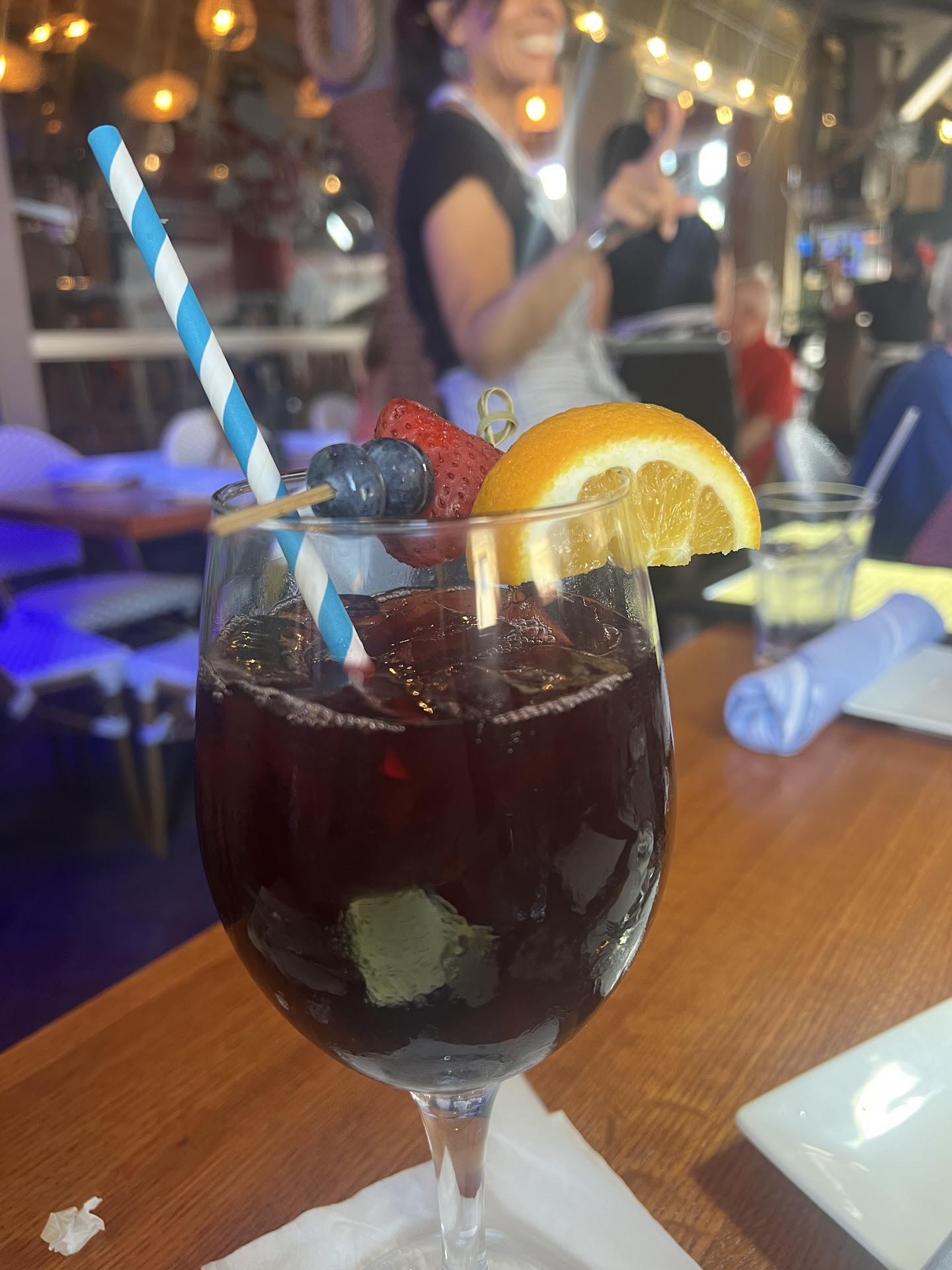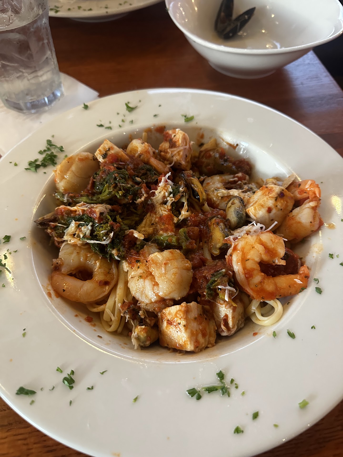 We started off with the red sangria which was very refreshing after a day on the beach, followed by the crab cakes, calamari, and garlic bread as appetizers. All were delicious, but I have to shout out the calamari as it was truly the best I’ve ever had-fresh, not chewy or greasy, lightly battered, with a sweet chili sauce which complemented it perfectly. Next came our salads, and I tried the blue cheese dresssing per a recommendation from a friend who said she loved it despite not liking blue cheese…and I agree, the blue cheese was definitely not overpowering in this dressing and was a great choice.