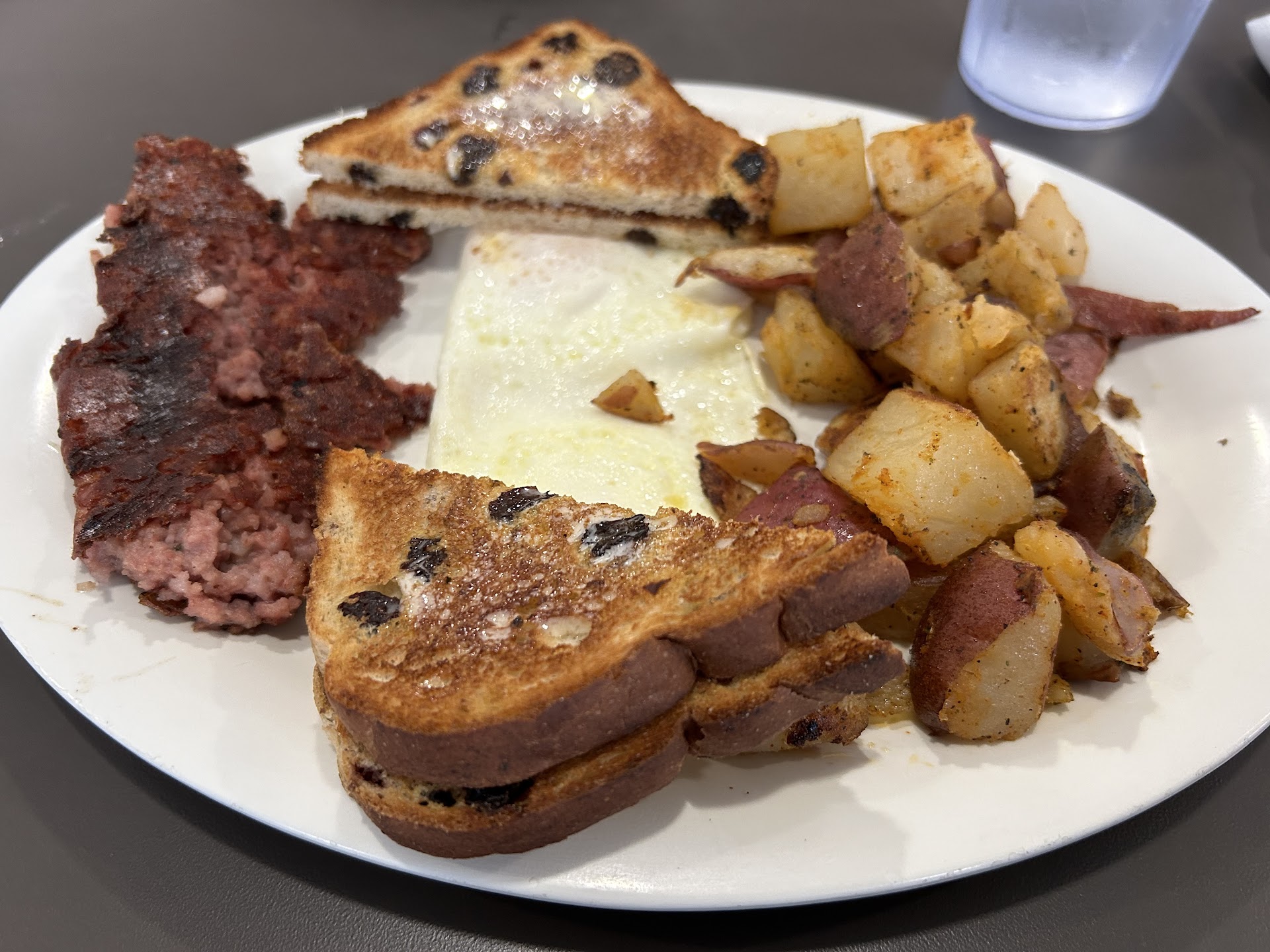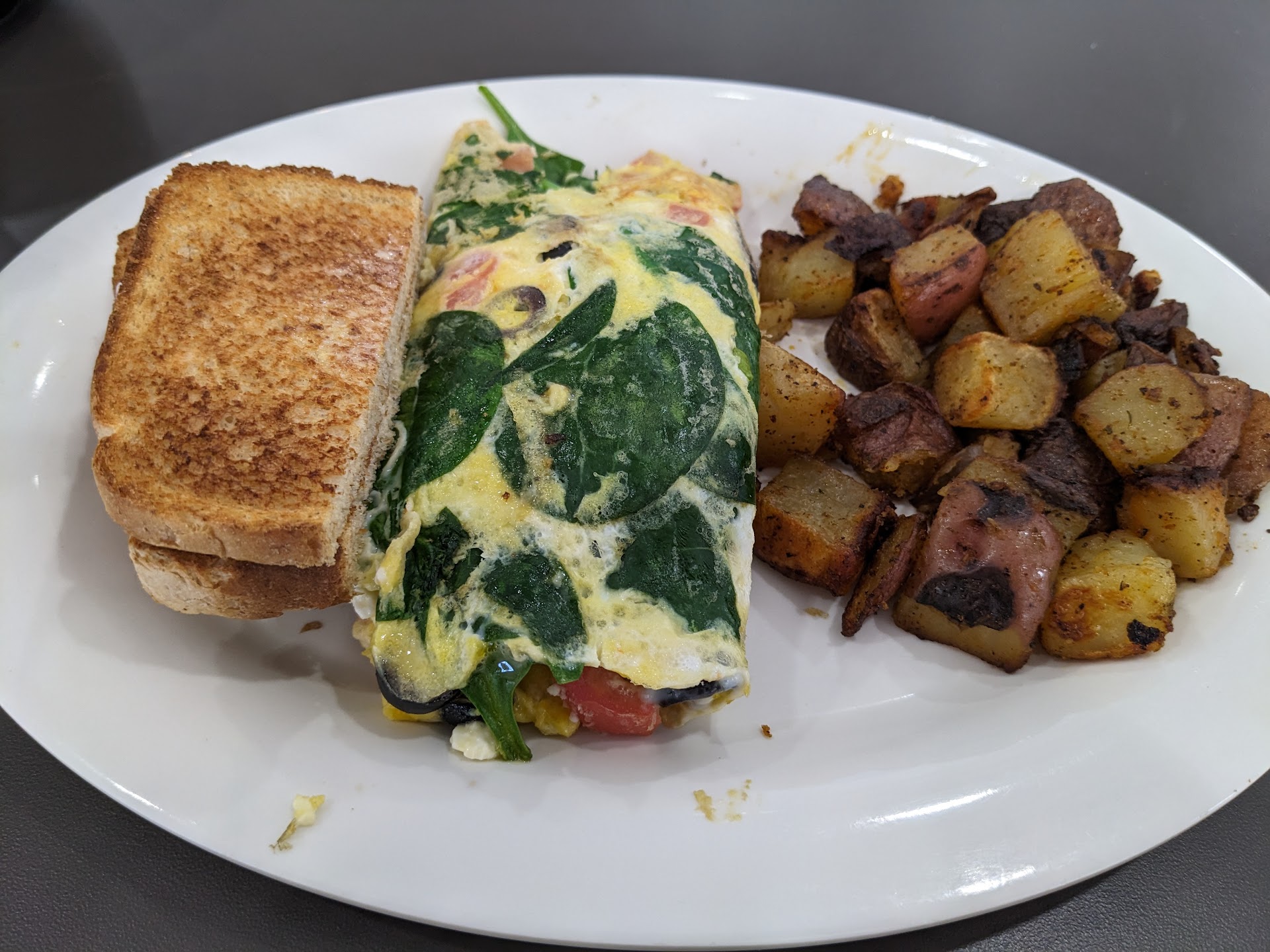The home fries were the largest potato chunks I've ever seen in this type of dish. Also very mealy and had no flavor, even with addition of onion and green pepper. Both eggs and potatoes were under-seasoned. Same for my husband's omelet. Bacon was odd: one piece was flaccid but another too hard to chew. Toast was left on the grill for way too long, seconds away from being burned.