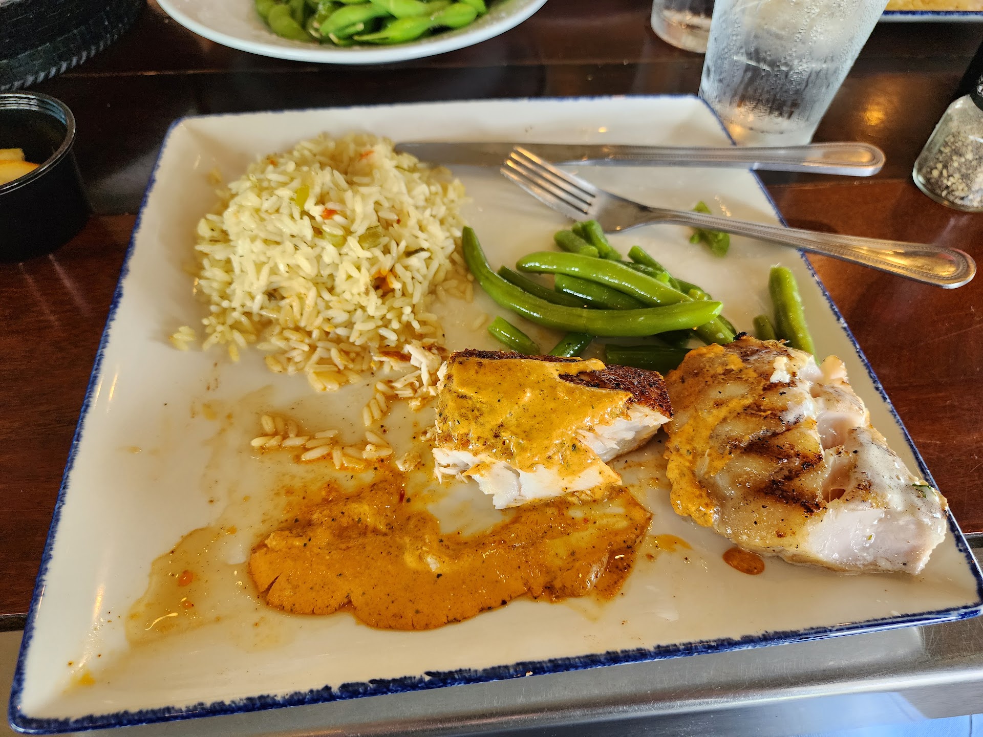 The tile fish was cooked well and had these exceptional grill marks on it. While we had never had tile fish before, everything you can read up on flavor states it to be "mild, sweet, and buttery like lobster or crab," but the piece we had was nothing like that flavor. It had a very harsh, fishy flavor that was pungent and aggressive. We needed to drive back several hours and I explained the situation because we weren't sure if it was bad filet or not. They ended up taking it off our bill and offered to cook something new, but we didn't want that and were truly inquiring about the flavor and if it was typical. The manager handled it very professionally.