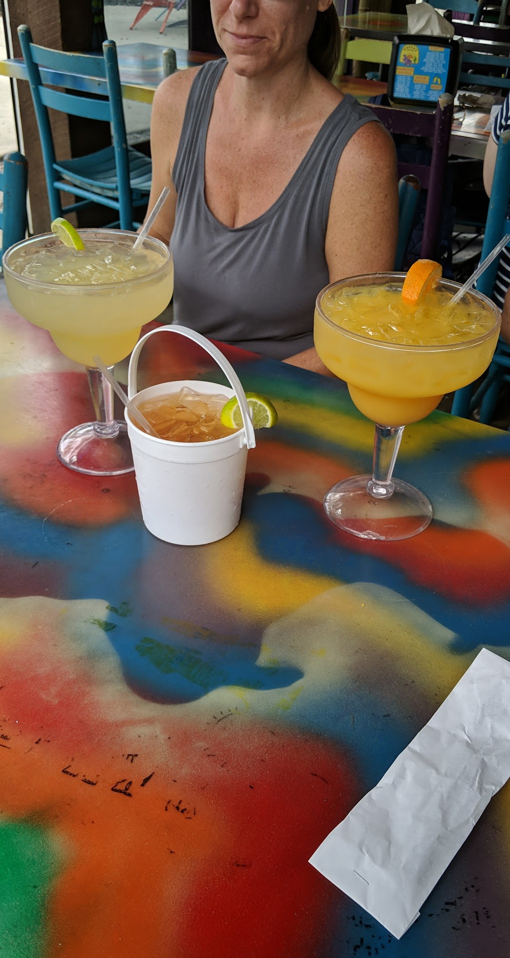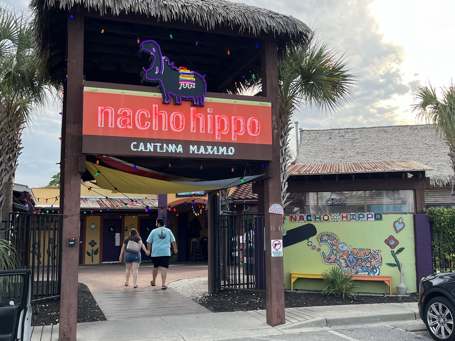 Read moreThis place had such a cool vibe, was decently priced, had huge drinks, and delicious food! We sat outside under bright colorful lights, providing a fun atmosphere. We got the Bleep Hole Nachos (jerk chicken nachos) for an appetizer, and we all devoured them. Honestly, they made the rest of our food almost seem bland, simply because they were so flavorful. They were the perfect blend of spicy, sweet, salty, and umami. Every one of us wished we would've ordered more! My mom got the smothered burrito. It was huge and tasted okay. She said it was average and was fairly bland, and the rice was a bit under cooked. She got the grande margarita, which was weak but tasted good and was fun. My dad got the day after nachos. He said they were traditional, cheesy, and the chili beans were a good cooling addition. The seasoned taco beef wasn't too flavorful, but it definitely hit the spot. For a drink, he got the drunken cooler. This was so sweet and huge, but again, not too strong. My boyfriend got the bangin shrimp taco was lacking in shrimp, but shrimp was juicy, and the sauce was sweet and tangy. He also got the Carolina kid taco, which had a decent amount of pork and was nice and tender. I got the kahuna taco, which was absolutely amazing. The pulled chicken was so tender and had the perfect ratio of sauce. The pineapple salsa and slaw were the perfect accompaniment, providing a fresh crunch and sweetness. I got the fried plantains as a side, and oh goodness, they hit the spot. They were such a shake up from the traditional side of fries and were so sweet, melty, and delightful. I definitely recommend hitting up this spot while in North...