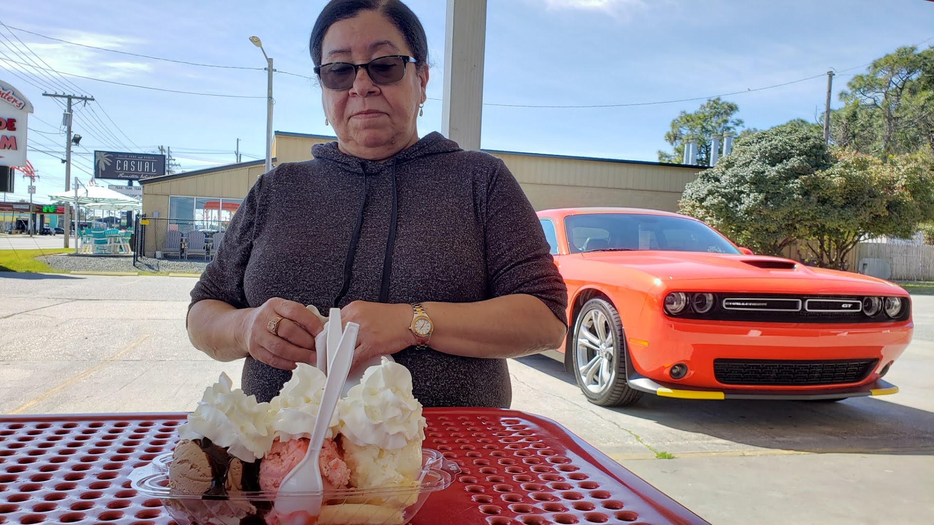 Read moreThe ice cream is good - but not worth the bad attitude. We’ve been coming here for years whenever we come to N. Myrtle Beach which is at least a couple times each year. Went tonight with our family of 6 and order about $30 worth of ice cream. When they handed my husband the wrong flavor - supposed to be just a scoop of their banana pudding flavor in a cup and instead got peanut butter chocolate - he said it was supposed to be banana pudding. Rather than just give us the single scoop I ordered, they pulled out the order slip, brought over the blond cashier and then she began arguing with my husband that it wasn’t what I ordered (he agreed it was, and he had heard me order it). She then YELLED at me ACROSS the crowd of people at the window that it “wasn’t what you ordered.” I get it. I work in an ER. I understand times are stressful. I’ve also lived in NYC and am not afraid of people with attitude, but was not expecting it here. We weren’t angry or aggressive, just asked for what we ordered. They could have just given us the cup - I don’t know why they wouldn’t (maybe the employees get charged for wasting a scoop of ice cream?!). Rather than argue with her in front of a couple dozen people and my children over a $4 cup of ice cream, I took the classier option and just said “that’s fine” and took the cup. I then saw an employee screech at someone when they didn’t respond to their number right away to the point the people at the window jumped. So unless you are a local (it sounds like they favor local residents), plan on fighting with an employee over a cheap cup of ice cream, or are willing to just eat whatever you get, this isn’t the...