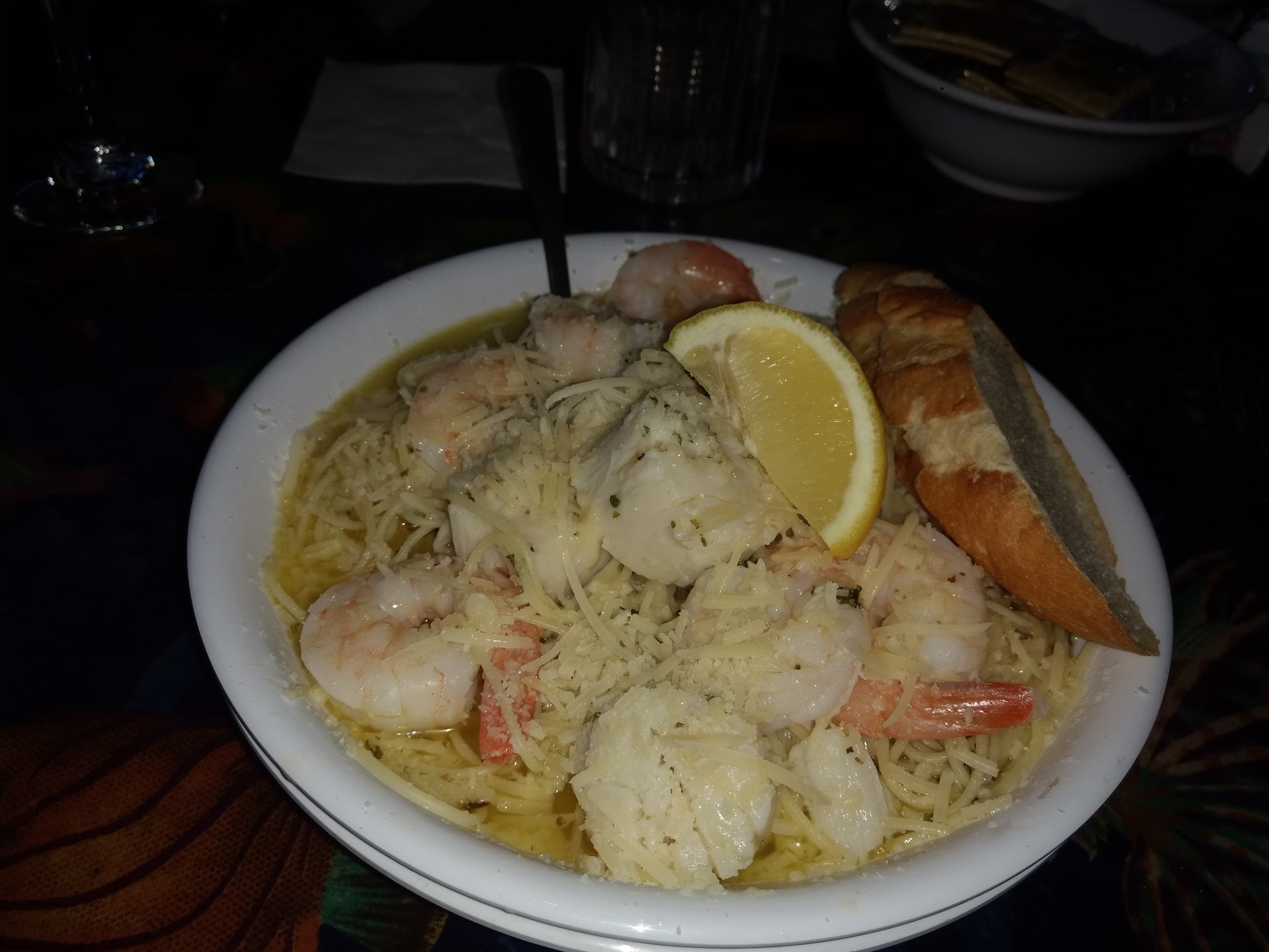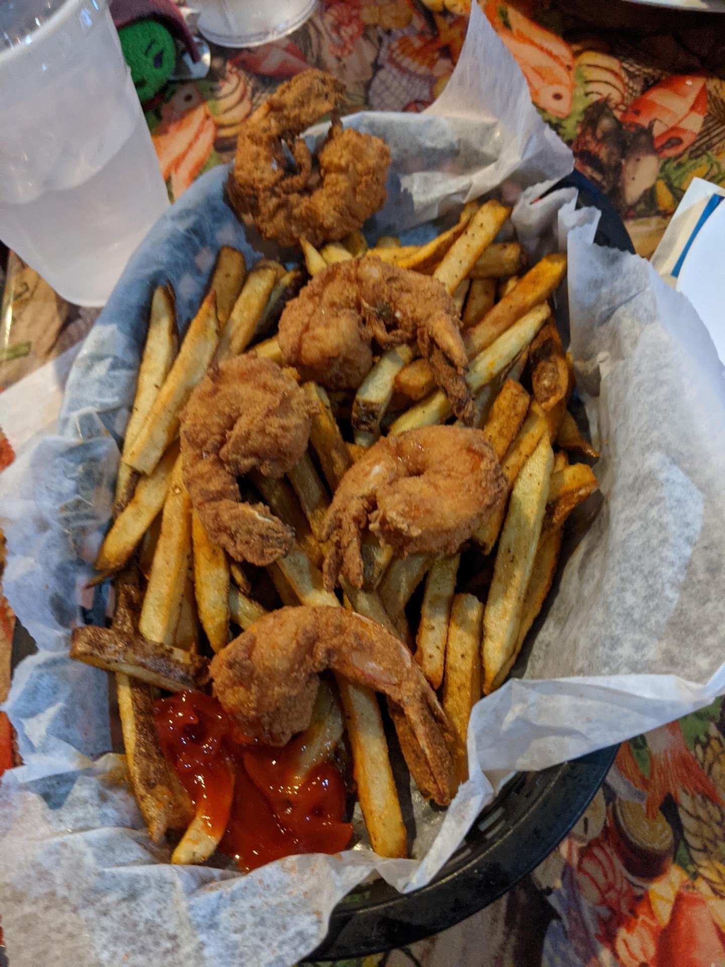 Read moreThe restaurant had a nautical theme. Table tops were seafood themed pictures and the lighting was a bit dim...intimate vibe. The service was friendly. Our server came around quickly and was attentive. All dishes were great. Prices were a bit higher than anticipated for a seafood place. We ordered calamari for an appetizer, it was so good I couldn't get a photo of it before it was gone. Light batter with parmesan shredded cheese as an unexpected twist, fresh lemon, and marinara sauce on the side to dip. One cup of She Crab soup was ordered, the two in the party who tasted it said it had some sweeter nutmeg like qualities. The girl child had the kids meal with fried shrimp and french fries. The adults LOVED the fries...hand cut and seasoned with old bay! The boy child ordered the crab cake sandwich with fries. This crab cake was good, crispy on the outside and cooked perfectly. The bun was a nice touch. One blackened grouper entree was ordered and came with steamed veggies and baked potato. The filet portion was large and had good seasoning. One shrimp and scallops steamer thingy with the wine herb and garlic butter sauce, they also added parmesan cheese. Shrimp were cooked great and the scallops were cooked good...a few tough spots on the outside of a couple...but the scallops were sweet and tender in the middle. The customer crowd picked up a bit when we were...