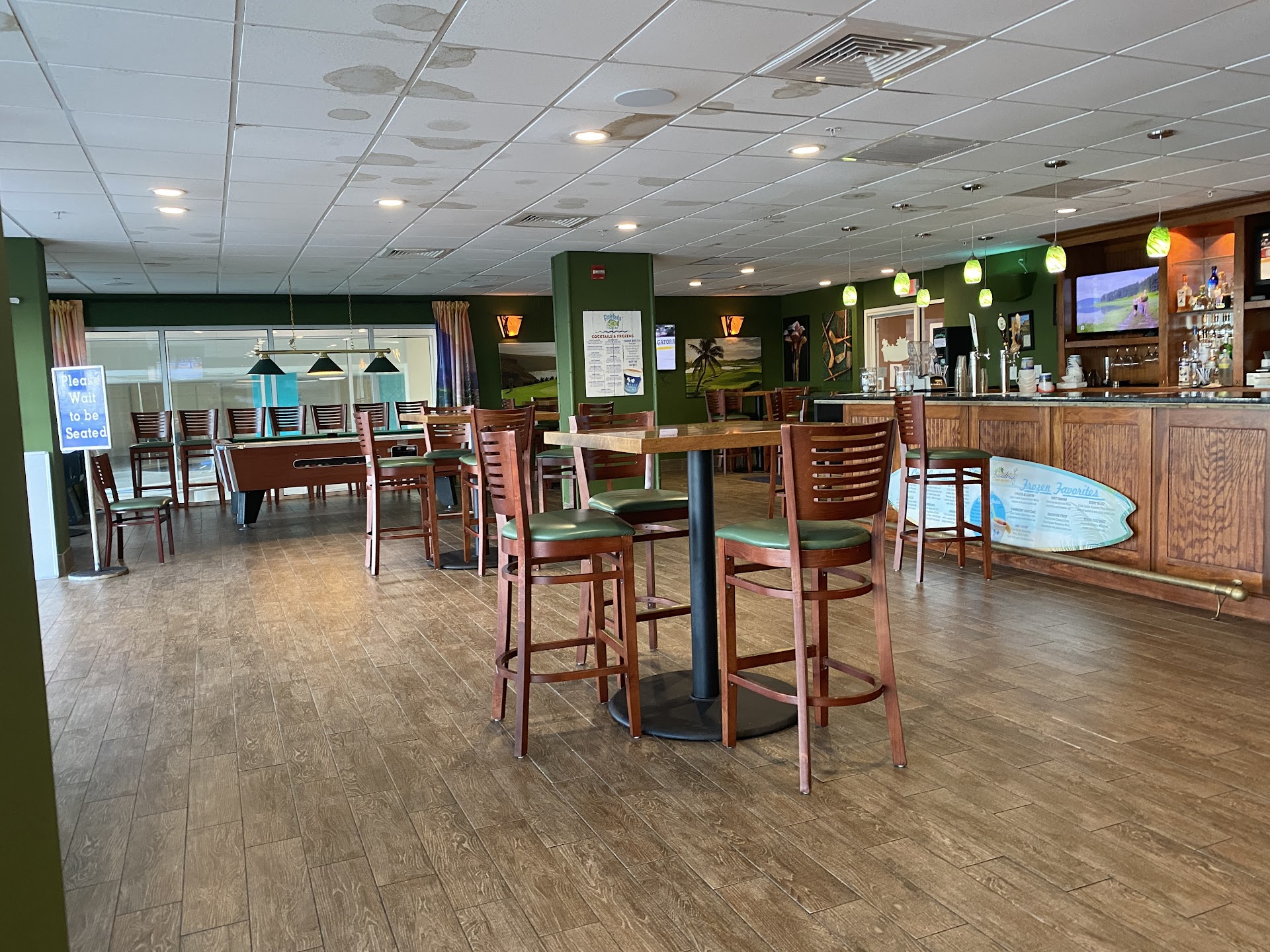 The decor is very dated, water stains all over the ceiling and a dark, dismal paint job. They’re advertising as a sports bar and grill, the TVs are 42” TVs and the bar itself is rather small. It seems to cater more to golfers with the excessive amounts of golfing photos...