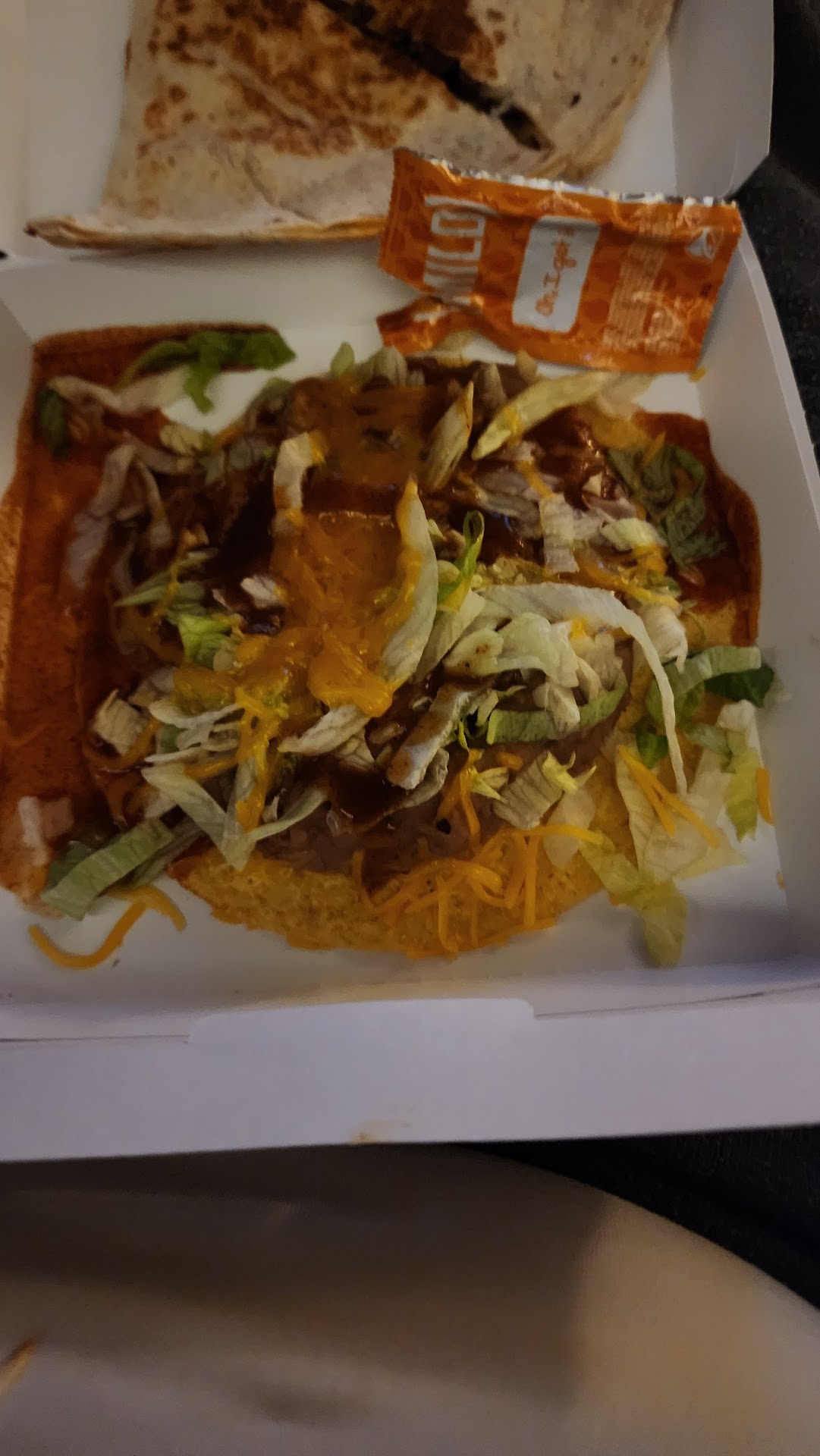 We began in the drive thru. The type on the menu was too small to read from the passenger side. We went in, and the menu type was even smaller. Had to get someone to read it to me. Many thanks to that customer! Stood at the counter register a while, apparently so employees could glance at us and keep walking. Then, we saw the self-serve places. Only two are there with people waiting to use them since employees didn't man the counter. We placed the order and chose sauces, all of it to go. When we got to the car, there were no sauces except the ones that cost 20 cents each, even though 4 of the free ones were requested during the ordering. We each had nachos, but the one with extra guacamole wasn't marked. If there were extra on them, it was hard to tell except that it had more smashed onto the box top. I wish it had more chips, too. Once everything has sat on top, some chips get soggy, and it's good to put a soggy one on top of the crispy ones. I can't wait to see what a screw up the burritos we got for later will be like.