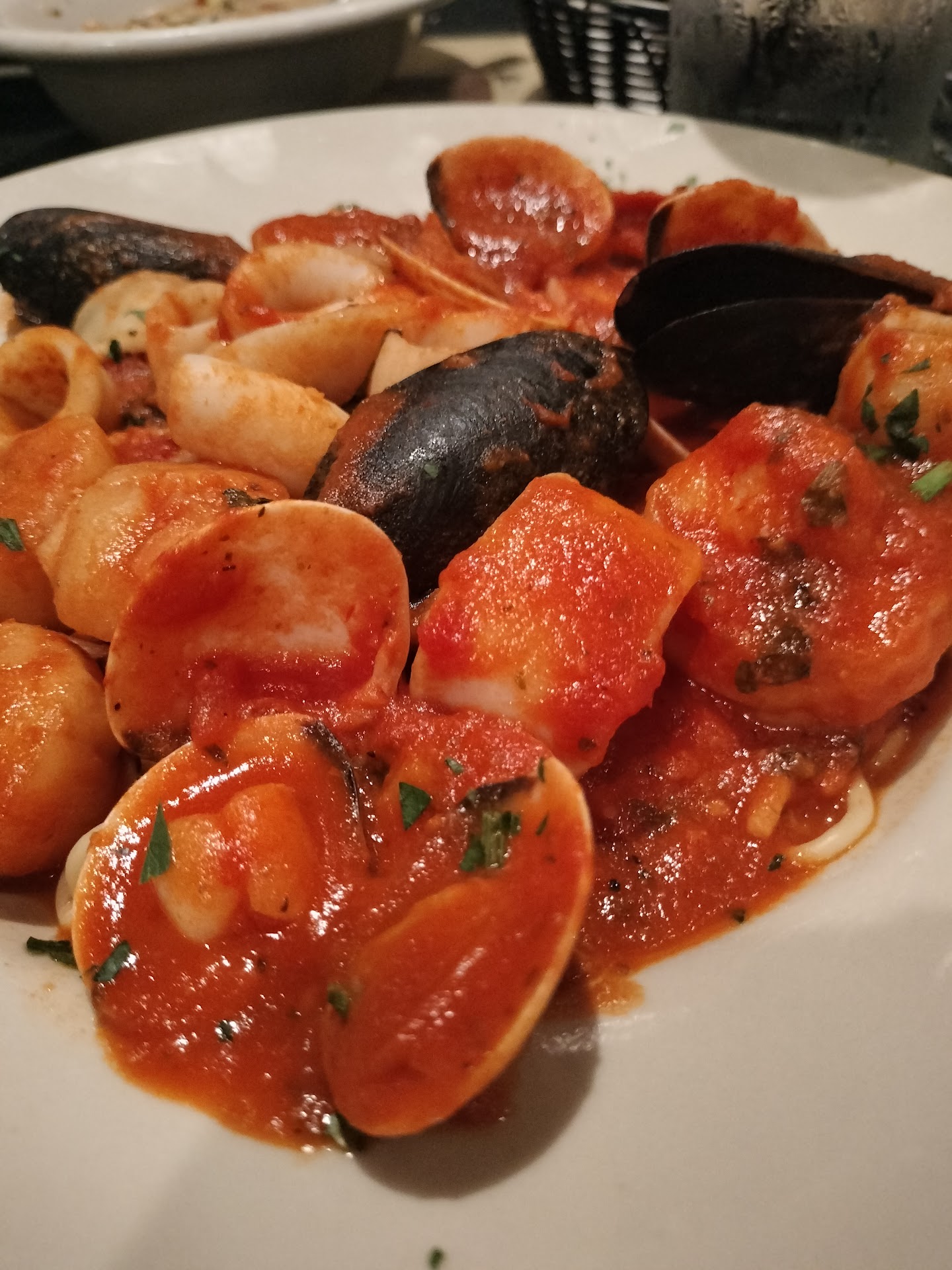 I would give the service and atmosphere 0 stars if that were an option. We were seated in the main dining room and the ambiance was awful. Baby pink walls, dusty fake planters hanging from the ceiling, cheap black table cloths, and plastic lawn chairs for seating. It gave off cafeteria vibes. It was so incredibly loud that we could hardly have a conversation amongst ourselves. Our server was extremely rushed during the entire meal. I asked for a few more minutes to look over the menu and he simply took the order of the person next to me and then asked me again, so I had to panic order. He never asked if we wanted drink refills or to order another bottle of wine. He kept trying to clear away plates that we were still eating from and brought out boxes for our food while we were clearly still in the middle of eating. He only asked one end of our table if they wanted coffee/dessert and when a few people said no, he quickly ran to get the check.