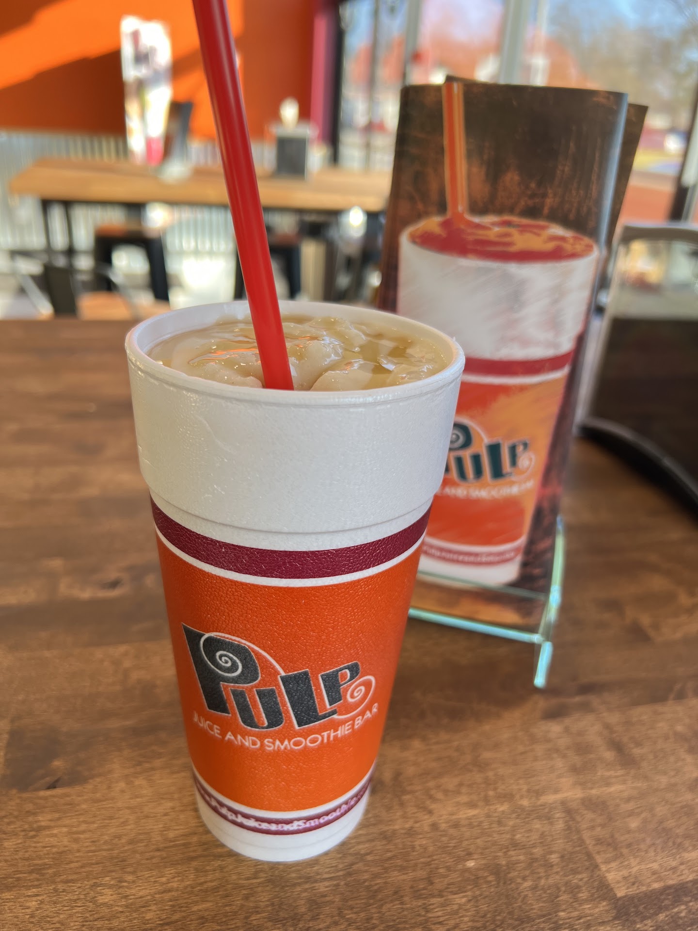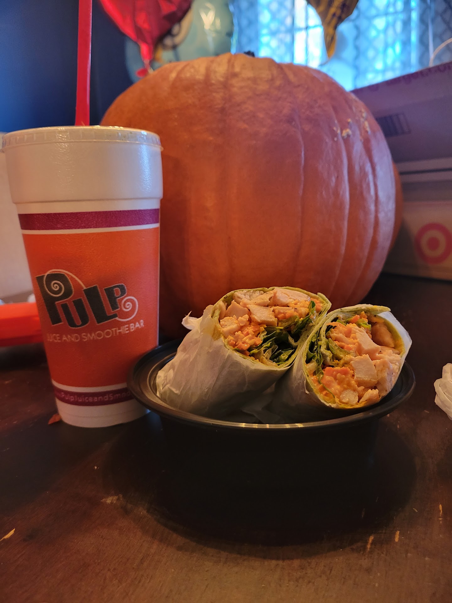I know the girls in this place are always busy and the young lady with the glasses is always so nice! My order always includes a Turkey avacado wrap with a guava burner or something with fat burner and everything is always fabulous but today my wrap was a hybrid of the avacado turkey and caesars chicken wrap, how do i know this because 1 half had no avacado, 1 piece of tomato and it had caesars dressing instead of mayo. Normally it wouldn't be a problem but i hate caesars dressing and/or ranch. I am 2 hours away now and will have to eat elsewhere. Mistakes happen and i watched the young lady put it together but it didnt click as she was really quick. I come there often so not a biggie, i would only suggest maybe more consistency. Another time i was made a turkey avacado wrap and they added a spicy sauce as well as the mayo....that 1 worked out fineš and i wonder if i can add that spicy sauce through the app?! But overall this pulp is solid, clean...