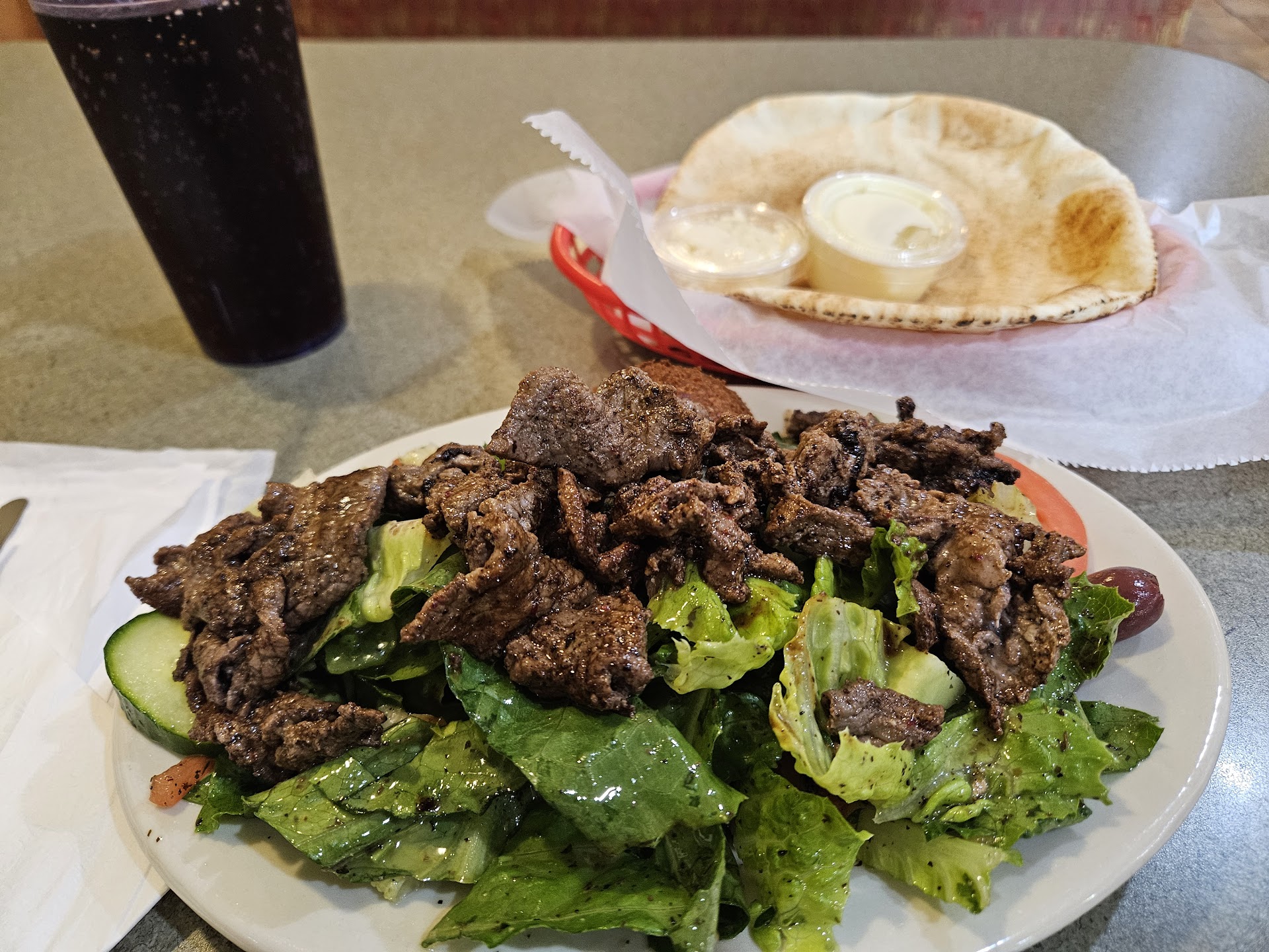 I was jonesing for something different so I ordered their spicy kafta pita. Lean grilled ground beef, onions, parsley, spices, tomatoes, pickles, tahini lemon dressing and Sitoo's hot sauce, in a pita bread. I was expecting more veggies (lettuce or something else?) to give it a little more 'filled' pita sandwich rather than flat, which was disappointing. BUT The smell and taste is amazing though! Had me a walnut Baklava for desset and that was as flaky and sweet as heaven. Price was good for the sandwich. 1 star deduction due to flatness of the pita sandwich---could have had more veggies. ...