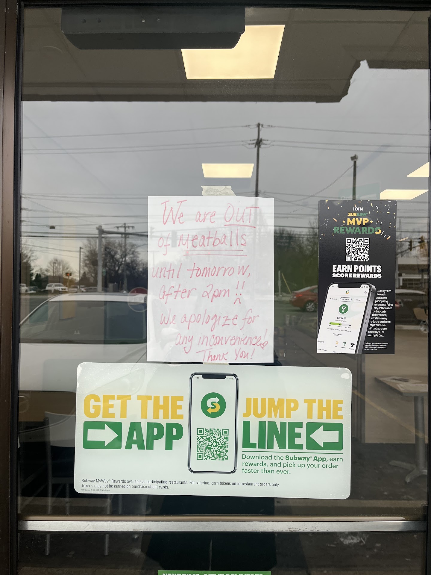 This is where her issue started. She posted a sign out of meatballs and I failed to see it before walking in. I tried to order a meatball sub and obviously couldnāt. I then expressed my disappointment as they had this same issue 5 days prior so I left and decided to come back and try again a different time.