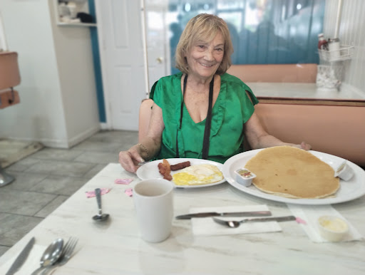 Kind of looked like a place for locals and when we arrived all the tables were full, however the old Woolworths style diner bar seats were empty. We sat there and we were immediately greeted by the smiling waitress. She promptly cleaned a booth and Mom and I ordered the breakfast special. It was something like 2 eggs anyway, 1 sausage and 1 bacon, a HUGE pancake and included coffee! I think it was $9.95 and totally worth it.