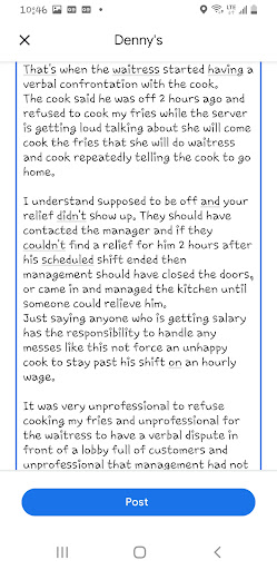 I would still return at different hours because my overall experience with Dennys has been fantastic until yesterday. Its disturbing that someone could do a hungry little baby bogus as your server did mine at her first visit to Dennys.