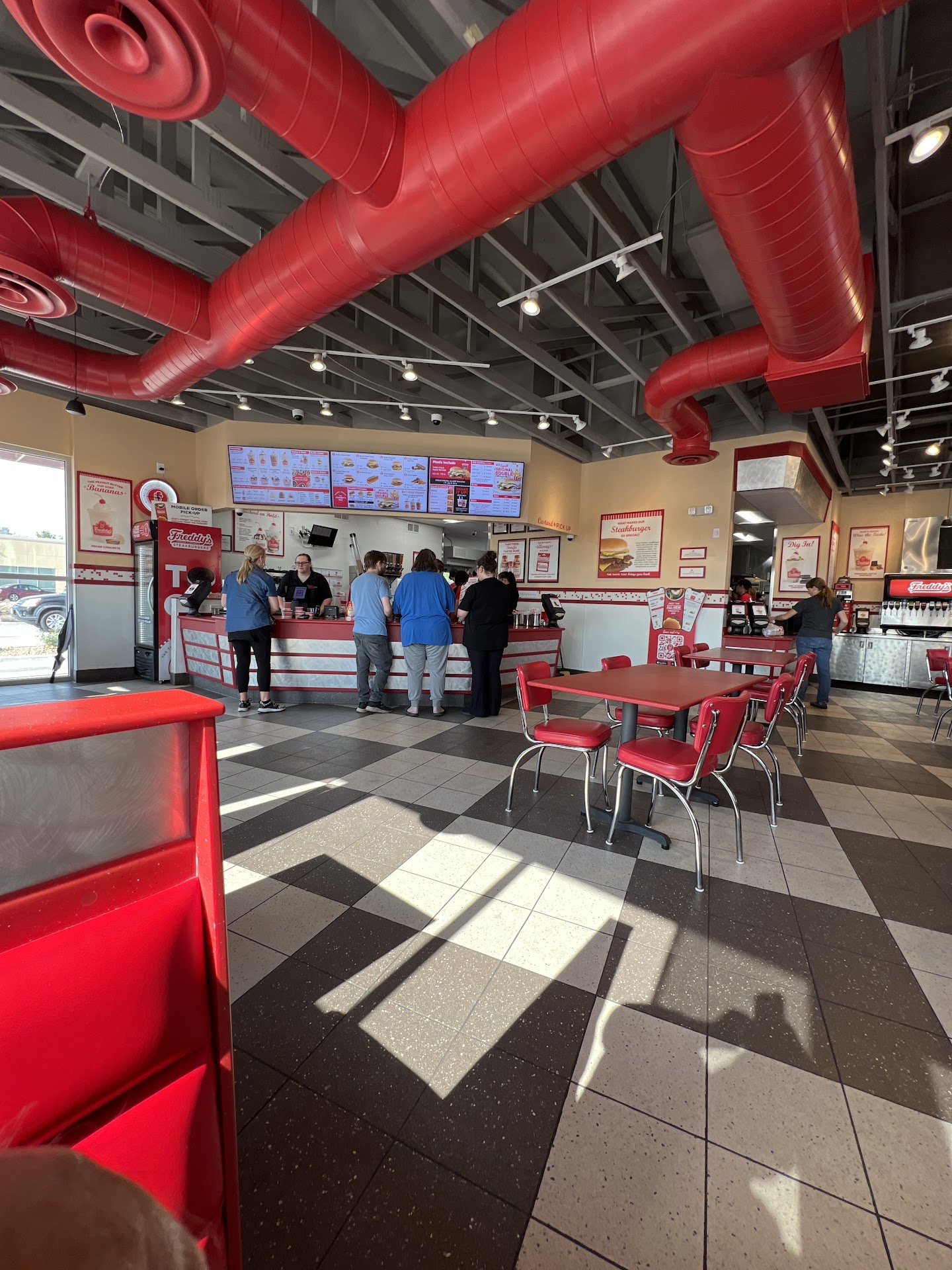Read moreFreddy's is a very good burger place. Their version of 'Steakburgers' stands up well with the competition and the fries are outstanding. Thin, crispy and perfectly done and not overly salty. They remained crunchy and delicious w/o getting limp. The menu features only double burgers but ALL can be made up as singles. A double was not overwhelming and the single is the perfect size for a medium appetite. The signature Turtle Sunday was delicious and using WARM pecans is brilliant. The amounts of hot fudge and warm carmel was perfect. Fast, tasty and friendly service in a basic burger joint makes it a 5...