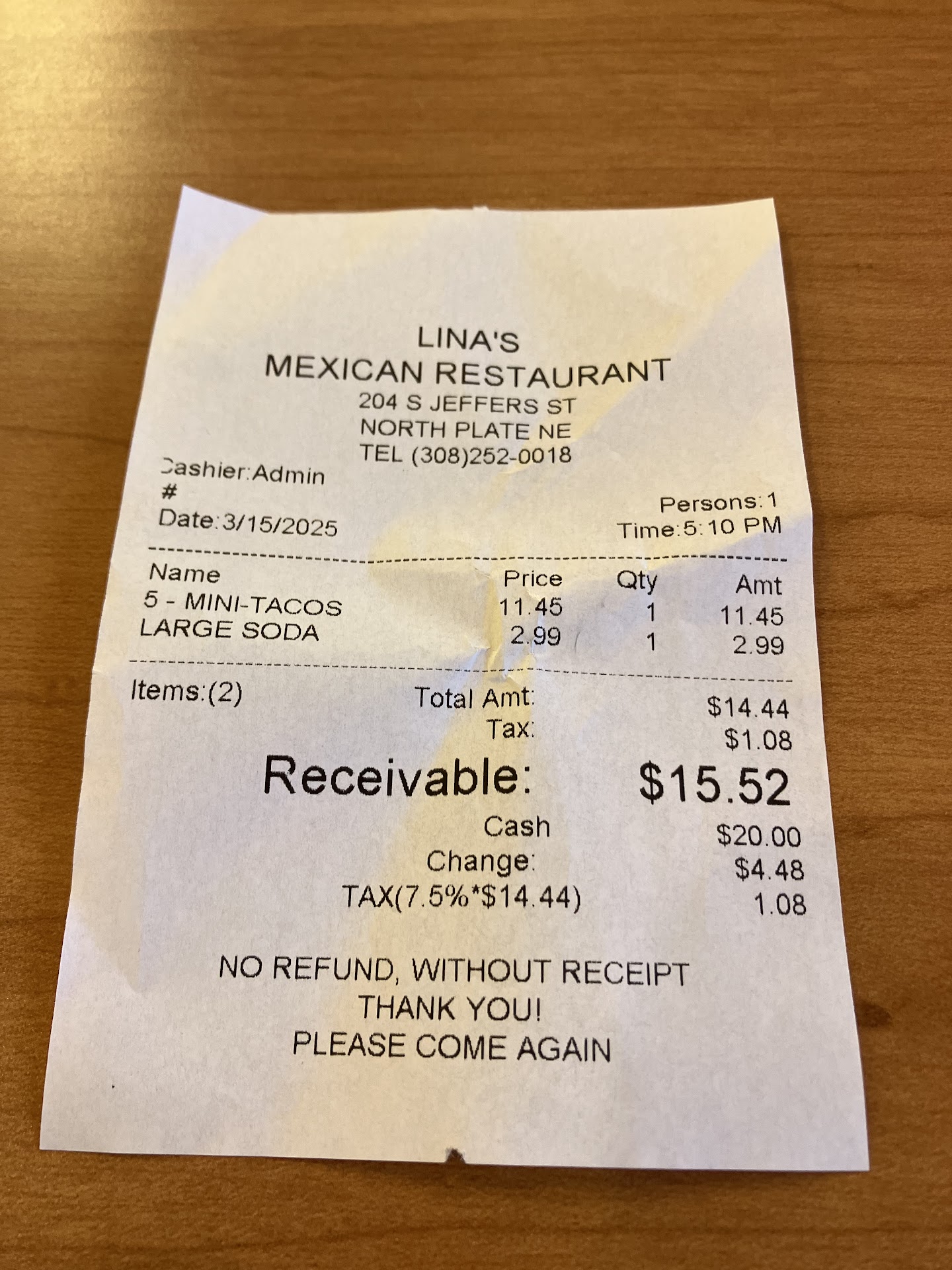 Read moreFirst let me say that I love this place. No need to read further if you’re looking for a place that you’ll leave satisfied! This is the place you’re looking for. The restaurant is well kept and brighter colored. Each time I’ve been in, it is clean. The employees take pride in cleanliness. The service is always top notch. The employees are always kind and never mess up an order. As for the food, it is well seasoned and always hot. You must hit up the salsa bar! Delicious! My bean, cheese and rice burrito hit so well and do yourself a favor, get the chips and cheese! It’s a bit spicy for a gringo, but I loved every drop of it! There’s a reason why I keep coming back to Lina’s, it’s a stellar...