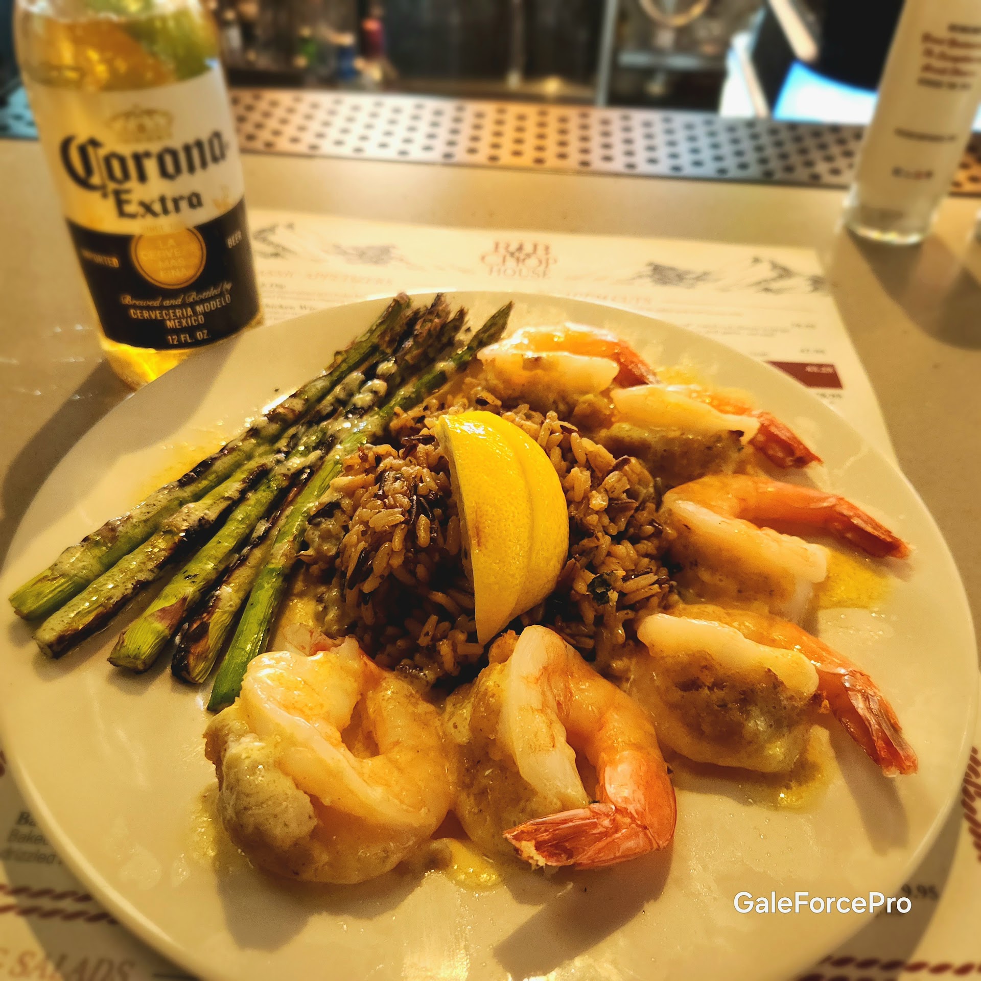 The main course consisted of six large prawns stuffed with crabmeat, served atop a bed of wild rice and accompanied by tender, lightly grilled asparagus. The asparagus was expertly prepared, featuring small, delicate spears seasoned simply with salt and pepper. The prawns were cooked to perfection and exceptionally flavorful. The dish was well worth the cost. I concluded the meal with a perfectly executed crème brûlée, featuring a delightful crisp caramelized sugar topping.