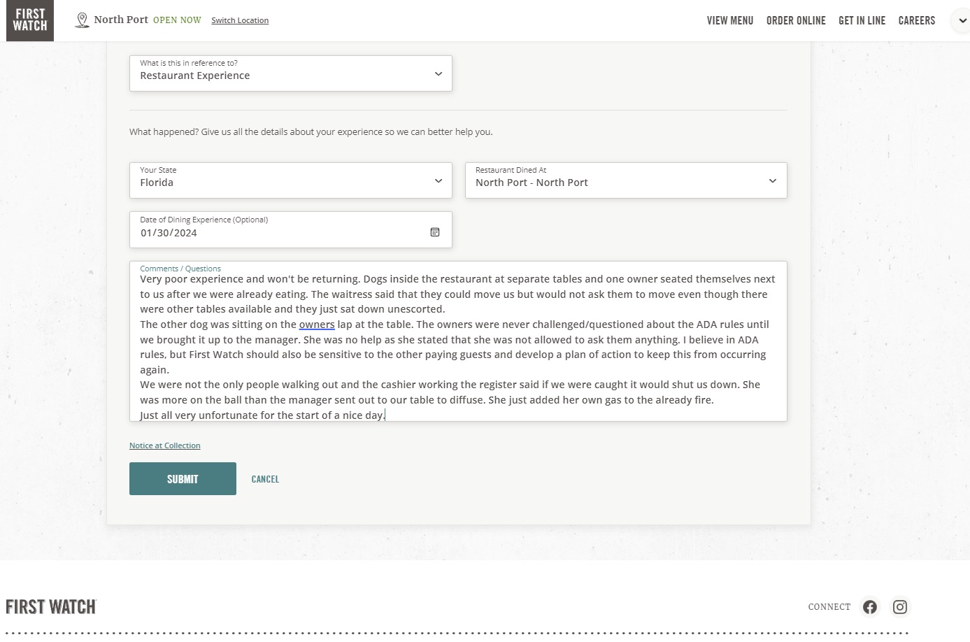 Read moreUsually, one of my favorite restaurants and both my wife and I enjoy eating here once or twice a week. Today happened to be a horrific experience. We were seated out side, which we requested. When I sat down on my chair, something brown that was on the chair, got onto my expensive dress pants. Then I looked down and my shoe was stuck on huge wad of melted gum. Both my wife and I then ordered pancakes and I asked for ice water with lemon and my wife got iced tea. My water came, but no lemon wedges. I asked the waitress again to please bring some. Once again she never came...so I asked a third time and finally I received the lemon. When our pancakes arrived, both my wife and I noticed that they were not very warm at all. Possibly they sat for sometime before the waitress brought them. I then stated to the waitress that I do not have any syrup. I sat there for approximately 8-10 minutes and still no syrup came. I finally got up from my table and went into the kitchen area and stated, " can I please have some pancake syrup?" The syrup was then brought to my table. At this point, I told the waitress now my pancake is quite cold and I want a new one made. The new pancake was made and delivered to me by the manager. Needless to say, I will be sharing my experience with others.... I don't plan on giving up on the restaurant, but this experience certainly has dropped First Watch in Coco Plum to a new low...