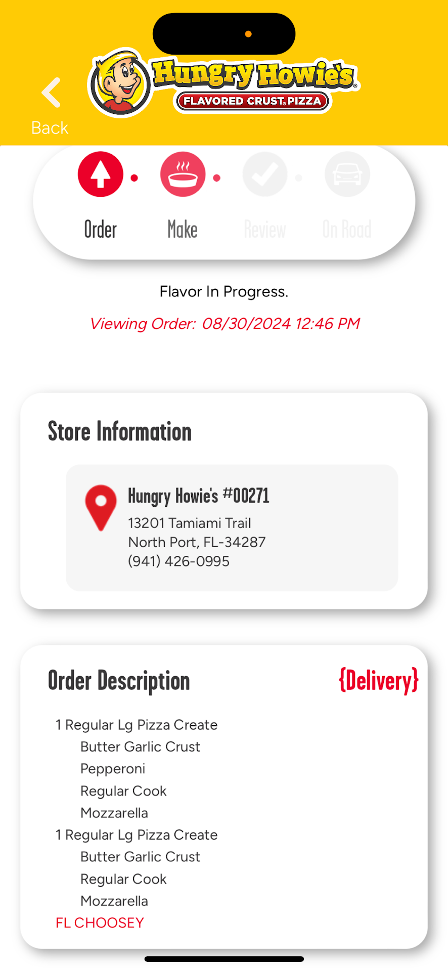 First off I would like to just say I have worked in this industry for quite some time and I know how Pizza places operate and I am familiar with how pizza delivery works. On Tuesday, May 14, 2019 I placed an order online at 7:55pm. Itâs stated it would be 45 minutes. At 8:45pm I checked the app and it said my order was out on delivery. At 9:00pm I called the store and spoke to a man (who I later found out was the owner) who told me my food was out on delivery. At 9:15pm I finally received my food. The food was incredibly greasy as well as the boxes it was packaged in. The food was also cold. I looked at the delivery ticket and it was time stamped 8:10pm. What this means is my food was coming out of the oven and ready for delivery at 8:10 and I didnât get it until 9:15. My food sat somewhere for over an hour!!! Being as it was already past 9:00 and I was in for the night I went ahead and ate some of the cold pizza and attempted the cheesy bread. The cheesy bread became hard from where it sat so long. The more I thought about it the more upset I got. It wasnât just the long wait time but a combination of everything. The next day I called Hungry Howies 4 times!!!! The first time no one answered.. the remaining 3 times it was the same person who couldnât âhelpâ me. I was told I needed to speak with the manager/owner, who was out taking deliveries. I was told there was no manager/shift leader in store. On the final call this same person questioned where the food was from the night before and if I ate it??? I told them I had ate some of it, and thatâs how I knew it was cold and the cheesy bread was hard. I told them that part of it was in my refrigerator.. I was never asked to bring it back. I told this person at this point I wanted a full refund!!!! The person said they couldnât help me and I needed to speak with the owner, who was still out on deliveries! I told this person I was just going to call corporate and they said âok, go aheadâ as if they could care less. I then called corporate and filed a complaint with them and was told they would have someone contact me.. that was last Wednesday. Itâs now Tuesday and I havenât heard from anyone. I called corporate again and this time was told that the owner responded to my original complaint that I wouldnât get a refund because I didnât return the food.. corporate also informed me they couldnât/wouldnât do anything because the stores are all franchises and can make their own policies... I will NEVER order from them again!!! And I suggest you...