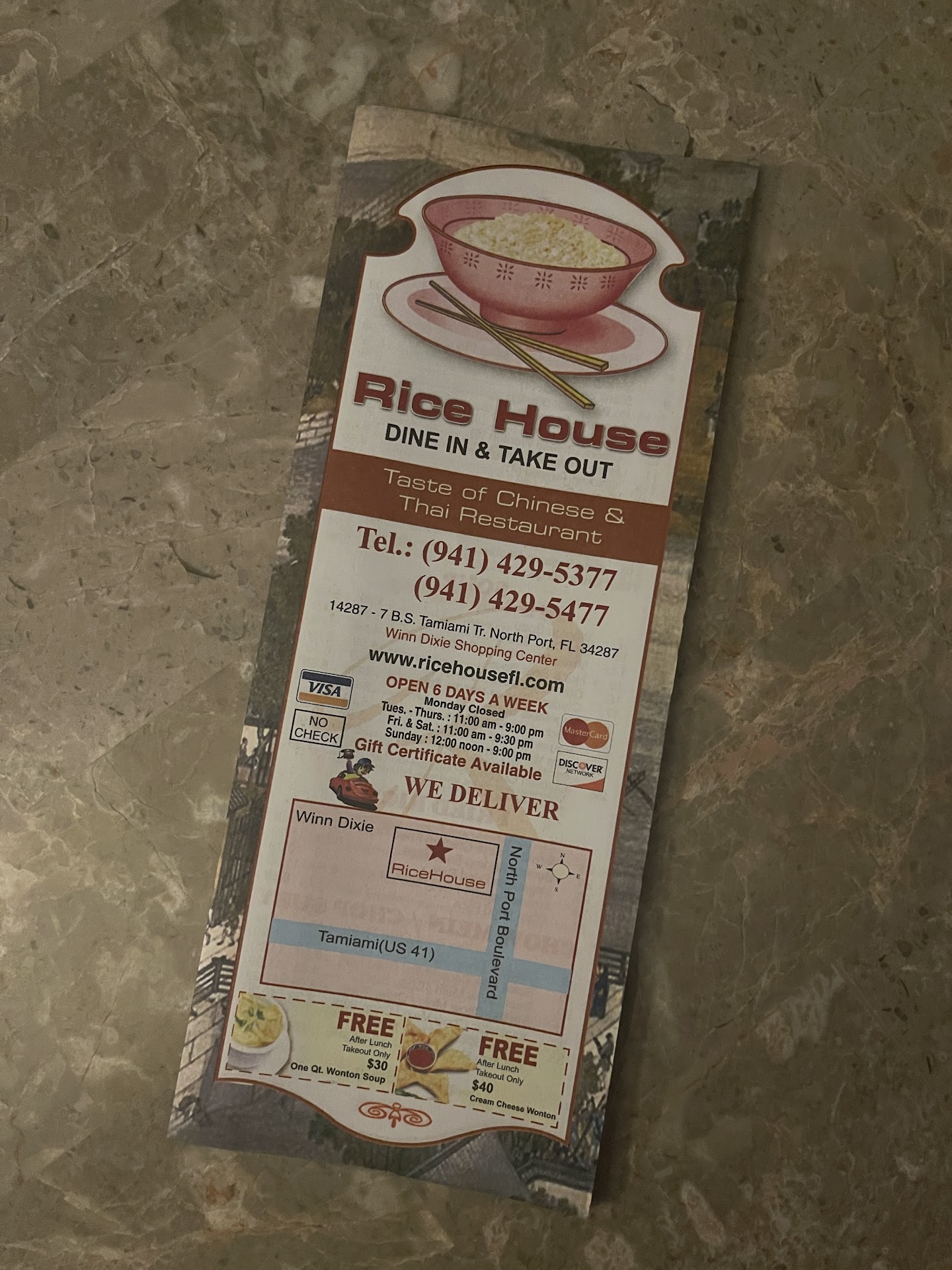We moved to Port Charlotte 3 yrs ago. Every Friday on the way home from work my husband would stop and pick up our order. He passed away in December. I still go to Rice House in North Port as no one man k es Gen.Tao Chicken like they do. I still get 2 egg rolls,crab ragoon. Shrimp fried rice & Gen Tao Chicken. I have enough for 2 meals. And they don't put heavy handed soy sauce. I get mine without it & add low sodium at home. Still my favorite Chinese Place. Nothing in Port Charlotte is...