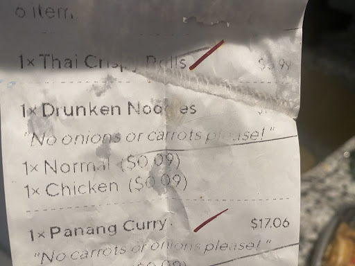Iâm rushing and donât check my order⌠(even tho I didnât have time for them to correct the order). One of my coworkers has a sensitivity to carrots and onions đ so she requested no carrots or onions in her drunken noodlesâŚ. And she got carrots and onions, so she could not have any of it. They did not put carrots or onions in the panang curry as requested but the sauce had an odd slimy quality. Iâm unsure why. I have had their curries before and they are usually great!