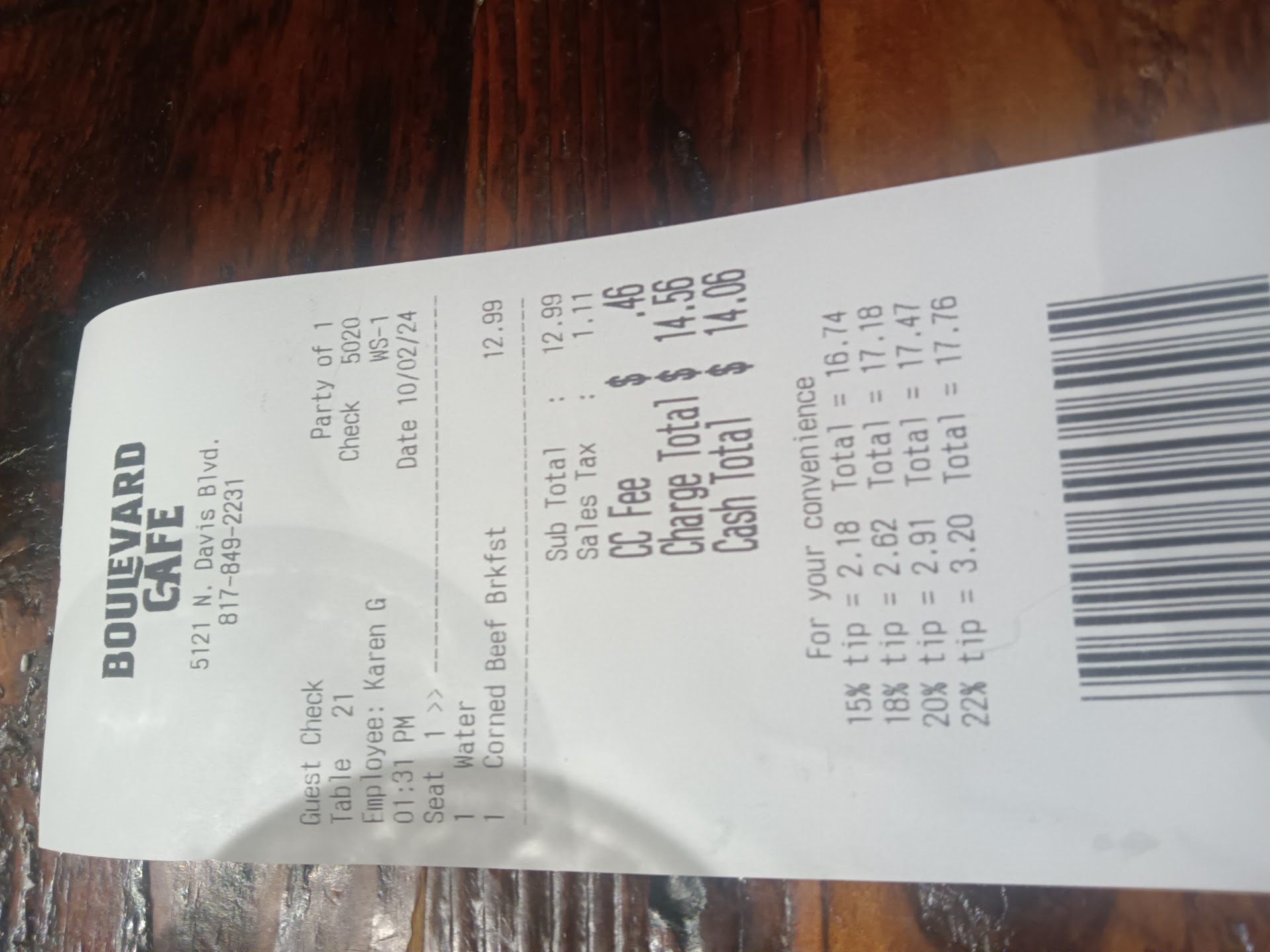 Read moreI came in a little after 1pm and Karen G was my server as it says on my tab. I ordered the Corned beef hash plate with eggs, biscuit (doesn't come with gravy, I guess you have to ask for it), and grits... I ate here last time with my cousin and he ordered the same and I had tried it which was good then. So I came back today for the second time and my corned beef hash did not taste the same. I had more hash brown than the actual Corned beef.... I told Karen G how come it's like this and she offered to take it back and remake it... At first I was hesitant cause I know that would irritate the kitchen people and they might spit or do something to my food, and I know my server probably didn't like that I was being picky. She came back with the dish and they just added more corned beef to it but for some reason it just still didn't taste the same from last time. I guess they have trouble with consistency, or maybe they had a different cook or food preparer today. I'm not sure but I wish I could have took picture of the first plate that came out . It was mostly just hash brown and scarcely any corned beef on it. Another thing is Karen G, my server gave me my tab immediately right after she brought my food out. Like I haven't even got to dig in yet and my check was already on my table as if she was rushing me out or something. I know this is not fancy dining which they do not give your ticket tab right away but still giving your ticket to diners immediately is not a proper etiquette thing to do when this is a sit down dine in restaurant... A party of 3 sat next to me and I noticed Karen didn't give them their ticket tab immediately... It must be because I was by myself and she probably thought I wouldn't tip or something... I didn't eat all my corned beef hash cause like I said it didn't taste the same but I still tip 36% of the total tab which was $14.06 and I gave $5 cash! Anyways I probably won't come...