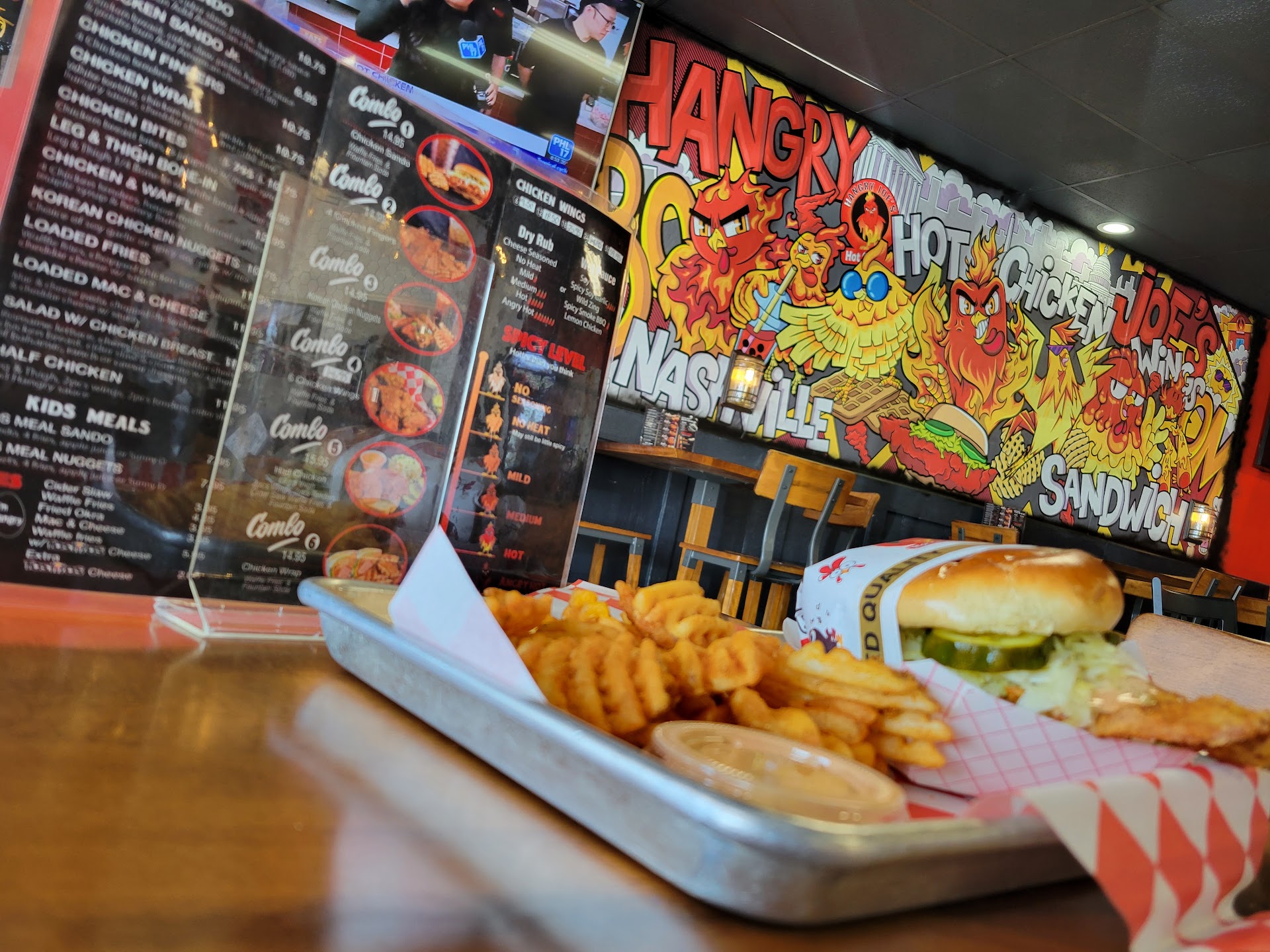 So when you walk in, you expect a bit of business, right? Completely dead, save for a few coming in ecery ten-twenty minutes. The person I made the order with was nice and even gave me some recommendations. Definitely had options on the menu to choose from. The most popular was their #1 Combo, and it took VERY long to make despite there being almost nobody. The food you get, for the price, wasn't the best. There was hardly any of the "Hangry Sauce," which tasted like your generic secret sauce at Jack in the Box, and the taste was rather lackluster no matter what you add it to. The waffle fries were... mid? I mean, I love waffle fries, but they were definitely below average. The drink it came with didn't even have any lids available. But the real let-down was the sandwich. I expected spice! Yet it tasted more sweet than anything with its "Cider Slaw??" They might as well take off the waiver if this is what they had to offer, "Angry Hot" must be their "Medium."