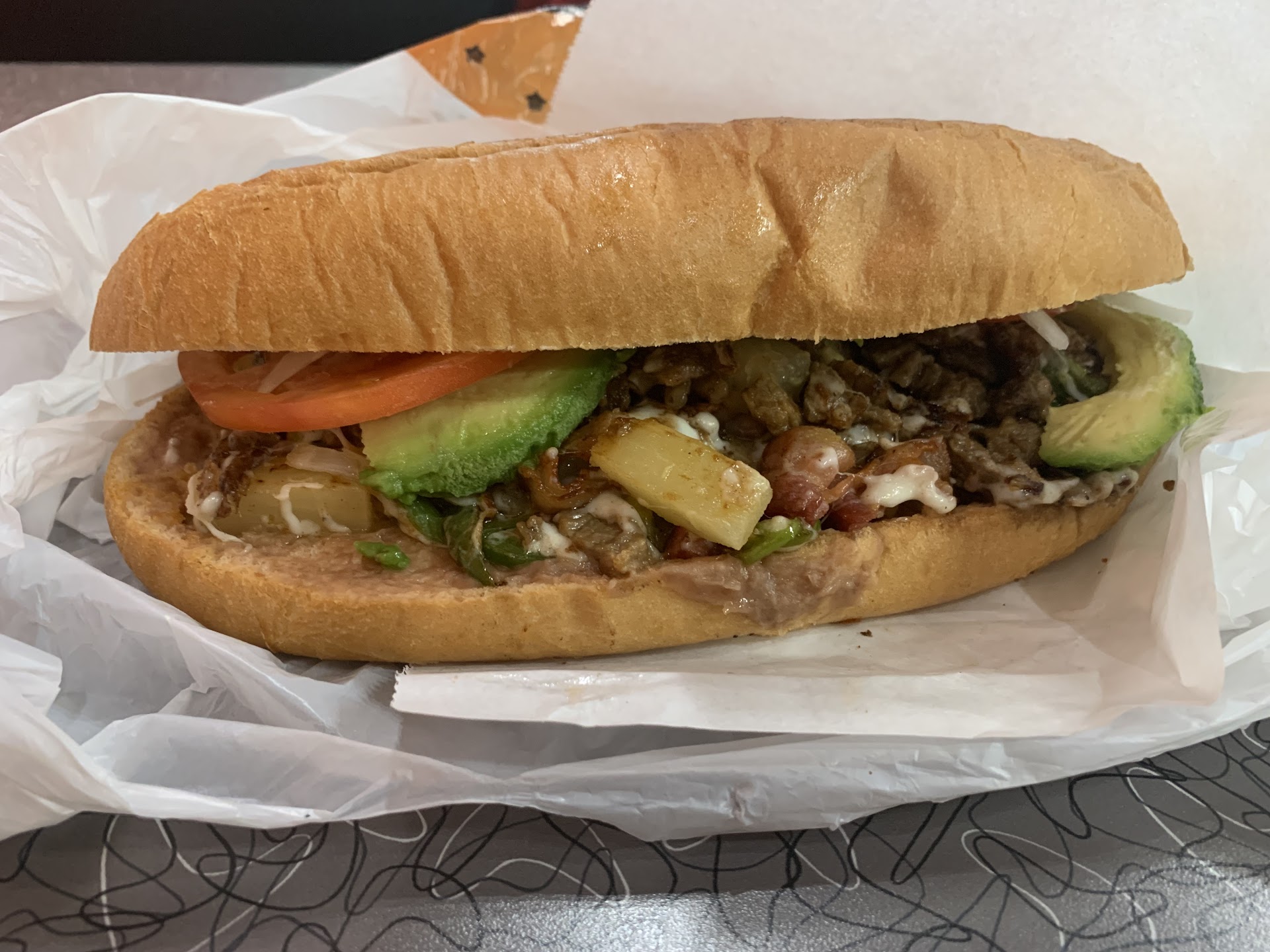 Read moreI ordered the Alambre torta, and two tacos, pastor and carne asada. I loved the alambre torta with the pineapples and crispy edges of steak with bacon and bell peppers, a nice amount of cheese and avocado as well. I liked pouring their green salsa on as well as it added a nice fresh citrus bite to the sandwich. The bread was perfectly toasted and held together well. Overall the torta was just a big delicious greatness and I recommend coming very hungry or saving half for later. 9/10