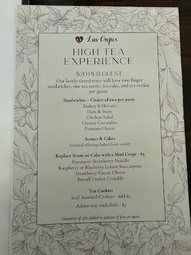 Everything at Luv Crepes Café was exceptional. We ordered two pots of tea (a pot is $8 and has about four teacups worth of tea), the Ginger Peach Turmeric tea was out of this world, and the Pure Peppermint tea was cozy and comforting. I had the Cafe sampler which came with three choices and I opted for the half chicken salad sandwich on croissant, broccoli cheddar soup and a salad ($15). I thought it was great value for the portion sizes and I felt satisfied. For dessert we split a Biscoff Cookie Crumble crepe, which came out quickly and was very heavenly - highly recommend! As in, it’s one of those foods you think about long after you had it. I plan to go back!! The shop is connected to an antique shop and we walked off our foods as we roamed through aisle after isle of antiques. I had a wonderful time at Luv...