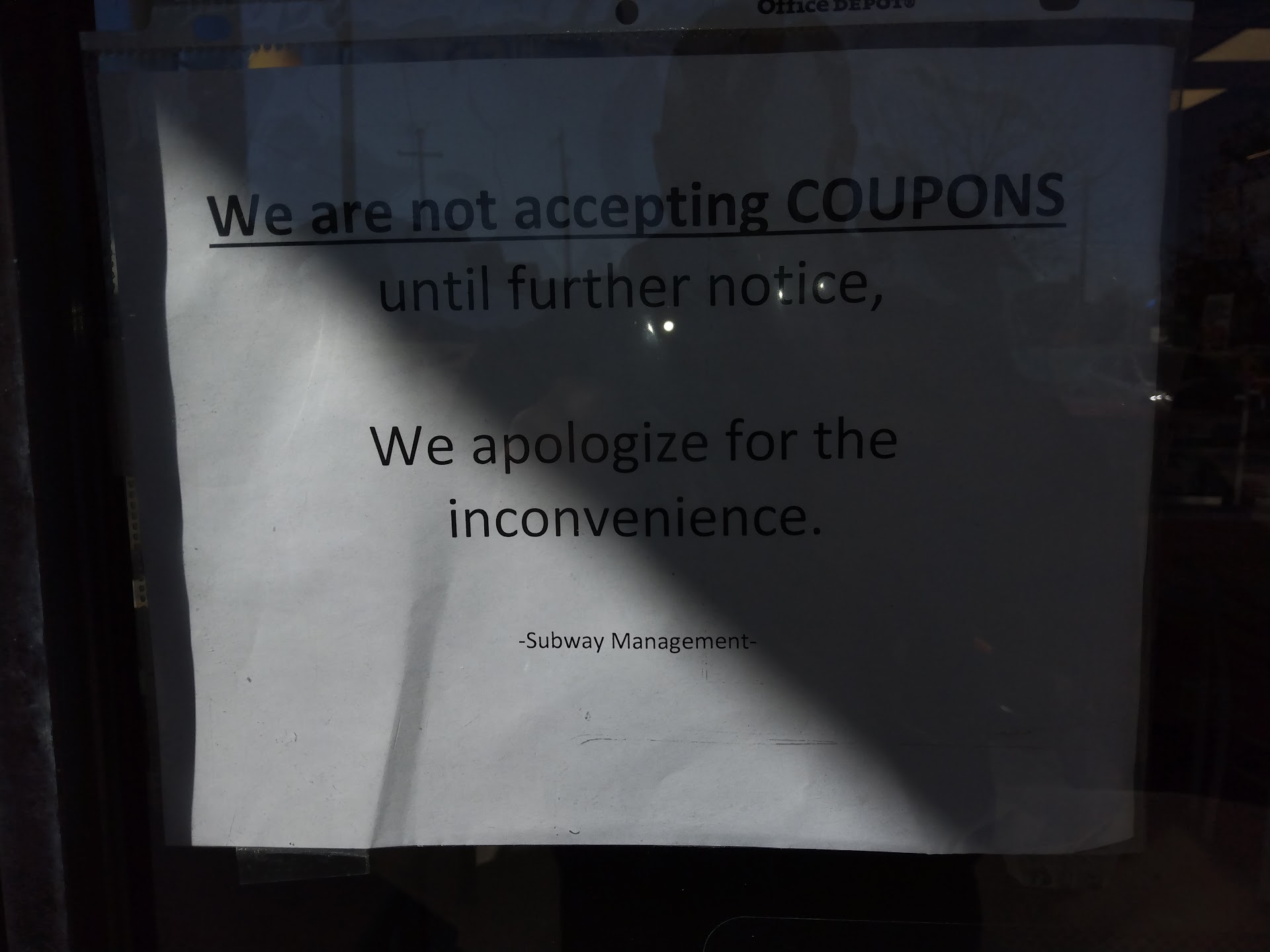 Read moreSubway sent out MAJOR LEAGUE coupons to residents within the area recently. So 4 people from our company decided to all throw in on Lunch. When I made it there, I didn't see the sign that said "NO COUPONS".