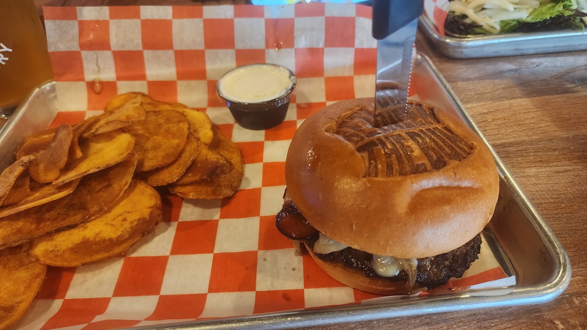 My husband ordered a side salad in addition to his burger, but he didnāt receive any chips with his meal, even though the menu said burgers come with chips. He paid full price for the salad, so it wasnāt an alternative side. The burgers were so small that when the waitress delivered one to a big guy sitting nearby, I actually told my husband Iād be embarrassed if I were her.