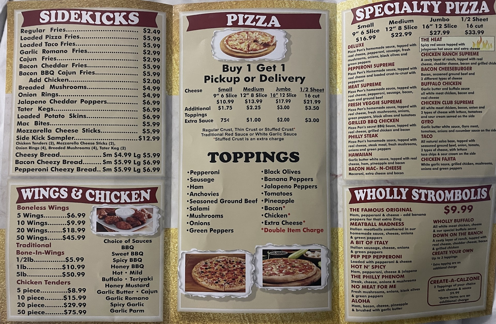 Read moreThis little Pop run Pizza shop is 100% generational! Runs down the family line. I saw Grampa Father, Son (or 2), maybe a brother but ALL IN THE FAMILY which made this little spot an all time 5 star rating for Me. It's a little far from home but we enjoy the drive to get My Husband's Favorite Stromboli. The food is amazing. The service is 5 star. It is by far the BEST PLACE I have gotten food from IN ALL OF 2025 and that speaks volumes! Probably the best in 2024! Everything was done to perfection. Customer Service is a HUGE deal to Me so when I say they are amazing and worth any drive I Mean it with A SMILE! 😃 Thank You so much for the Best Customer Service and Food I have had out to eat all Year! If I could nominate this place to be the PLACE TO VISIT I would! Thanks Again Pizza Pan...