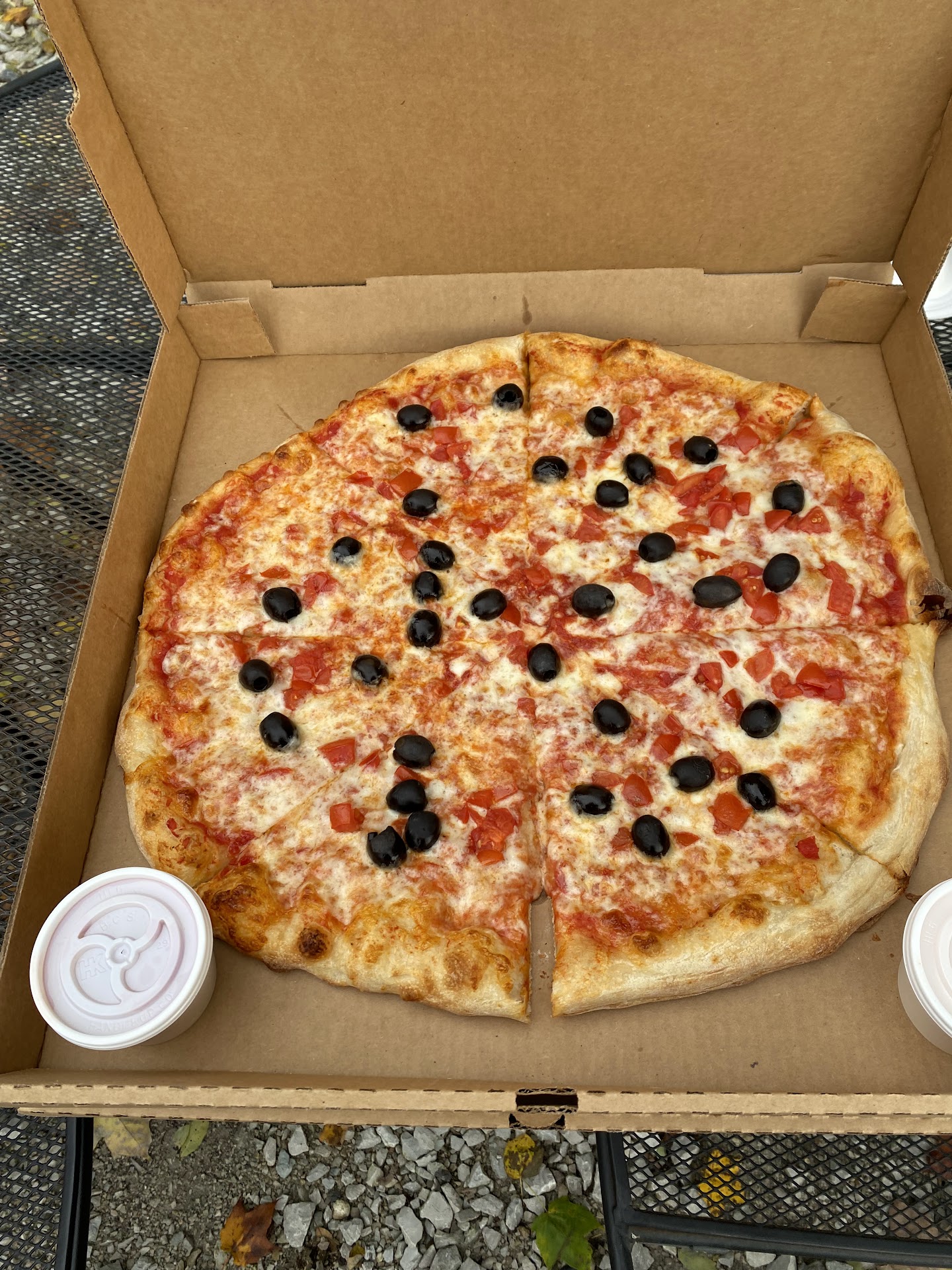 Read moreOur pizza journey continued to Perillo's that had been on our list for quite awhile. We ordered the NY style with black olives and fresh tomatoes. The Sicilian we had made with sausage, pepperoni, green peppers and black olives. We also had an order of their bread twists garlic. After picking up our order we just had to try a slice of the NY style right away. In the outdoor patio area, we each had a slice and it was one of the best first pizza bites ever. The flavor was slightly sweet, just the right amount of cheese and the fresh tomatoes were great. The crust as you can see was thin, perfectly cooked and a great chew. We also want had a garlic bread twist. They look like cinnamon rolls and were out of sight wonderful. Warm, soft , garlic brushed butter it seemed. Once home we tried the Sicilian. Great crust, cooked perfect with great mouthfeel. The ingredients melded well . The whole order was $52 and well worth it. There were only the two of us but what we ordered could easily serve like 6 or more. We're from Indy and it was a bit of a drive but one well worth it. ...