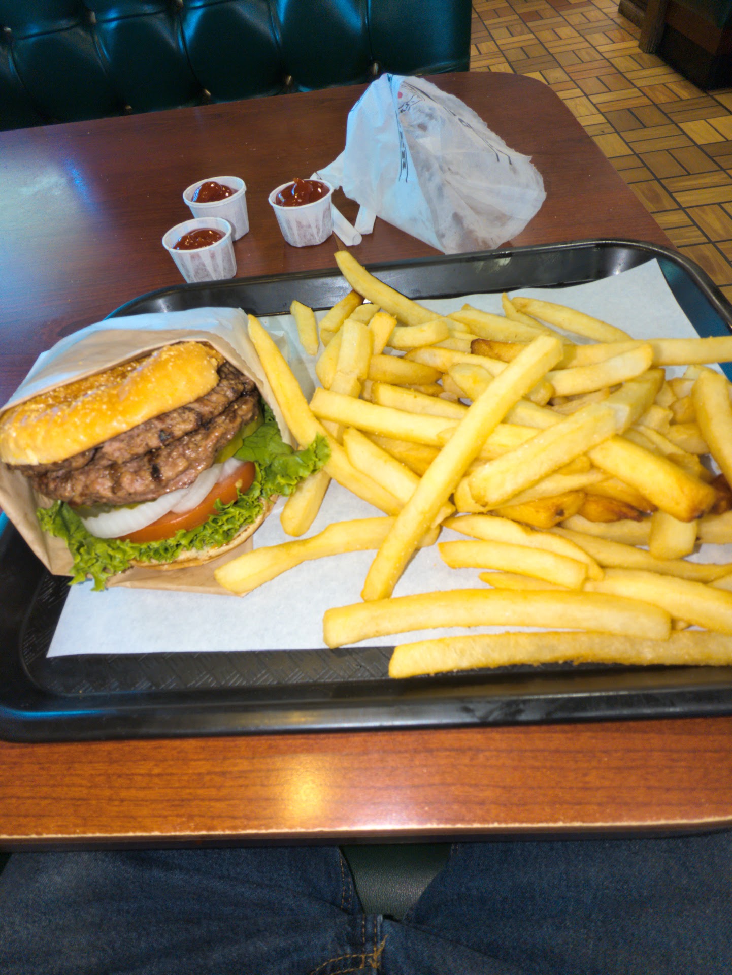 The service was good and there seemed to be a lot of workers there doing their thing. It didn't seem that busy based on the number of people inside but it was a little challenging to get the sauce dispensers filled up by someone. I'll just say that was a training thing as maybe the cashier is responsible for refilling them but had to wait for someone to show her. It wasn't overly clean but wasn't gross either. It just seems a little greasy and could probably use a good deep cleaning after flipping tasty burgers for a few years and having dirty handed customers touch everything possible.