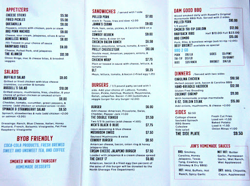Read moreAte here on vacation this week and Russell's has some of the best BBQ I have ever eaten; And I have eaten BBQ from coast to coast. Great variety on the menu, including kids selections. More than fairly priced. Pulled pork was extremely tender with the perfect mix of soft and crisp pieces. Rib meat came clean off the bone. Steak was smoked and juicy. Fresh cut fries were fried at the perfect temp with a nice outer skin and tender inside. Not super greasy. Baked potato was authentically baked. Salad greens were cold, crisp, and fresh. Russell's sauces were on point. Only restaurant on the trip I didn't need a take out box. If you're in the area, you don't want to miss this one. Bring your friends. They'll thank you later. Floor layout is accommodating for both small and large groups. Can't...