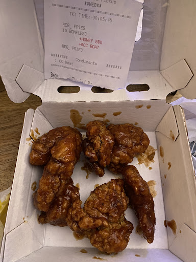 Read moreWe visited on Halloween also my son's birthday. Never been and that's what the Birthday boy wanted. The waiter was friendly, knowledgeable of the menu. Helped out sort things out. Just wasn't thrilled they got rid of celebrating a birthday. Which I guess was our fault, for not asking before we got seated. Place was basically empty, which was around 8pm. The menu is pretty basic CHICKEN lol. I whom doesn't eat chicken, had a hard time selecting. But .. it's what the Birthday Boy wanted! We ordered 1 Chicken wrap with dinner sauce on it with Salsa and chips as side. 1 bbq chicken tender meal with FF's. 1 Blue Cheese Burger with FF's ordered cooked medium, 1 chicken wing platter lrg size with a side order of FF's. Husband ordered 4 flavors with the platter. BBQ, Buffalo, 1 Asian flavor can't think of it, Parmesan Garlic I believe. The spiciest was the Asian flavor here did sweat lol. He is Asian and loves spicy food.. but this was SPICY. We did laugh at his expense đ The burger was a great size cooked wonderful. The bbq chicken meal was done well. Even though everyone swapped and picked from each other's plates. This happens often with us đ My wrap... since I had to order something... was a normal wrap size a lot of chicken. But they completely overloaded on the sauce. To the point that once again my husband said wth kinda of sauce is that?! The fries were really tasty as the family all agreed. Thin fries seasoned in served in a good amount of a pile. On the wrap mind you I don't do spicy like that, nor chicken lol. But the wrap was to soggy from too much sauce. I didn't complain or send it back, due to the fact we just wanted to go home. Along with the meals we got 2 sodas, 2 apple juices no refills on those, I asked for a hot coffee which they didn't have nor carry. So I didn't get anything. With tip bill came out to about $80- We went, we tried it, we experienced it. Nothing special, nothing grand. Just another chain restaurant that happens to server 90% chicken on the menu. Hence the restaurant's name lol. We'll we be back, maybe someday. Other places to try out here in Woonsocket. I must say the restaurant did look clean and in order. Didn't see the restrooms though. But if you love chicken, chicken wings with plenty of flavor options. This is the...