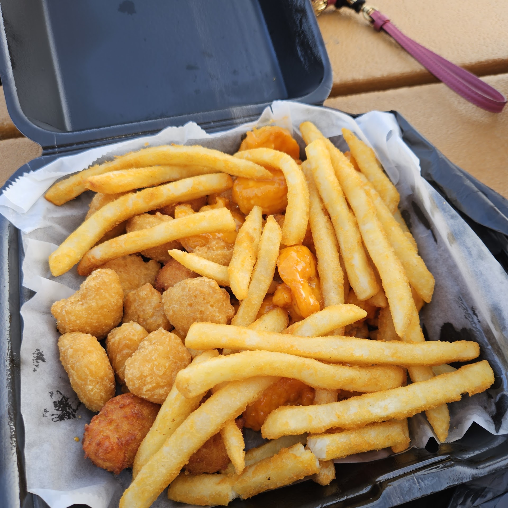We got it to go, nothing got soggy. Fries were great! Corn bites were shockingly good. This was more than enough for me and my teen to eat and be stuffed!