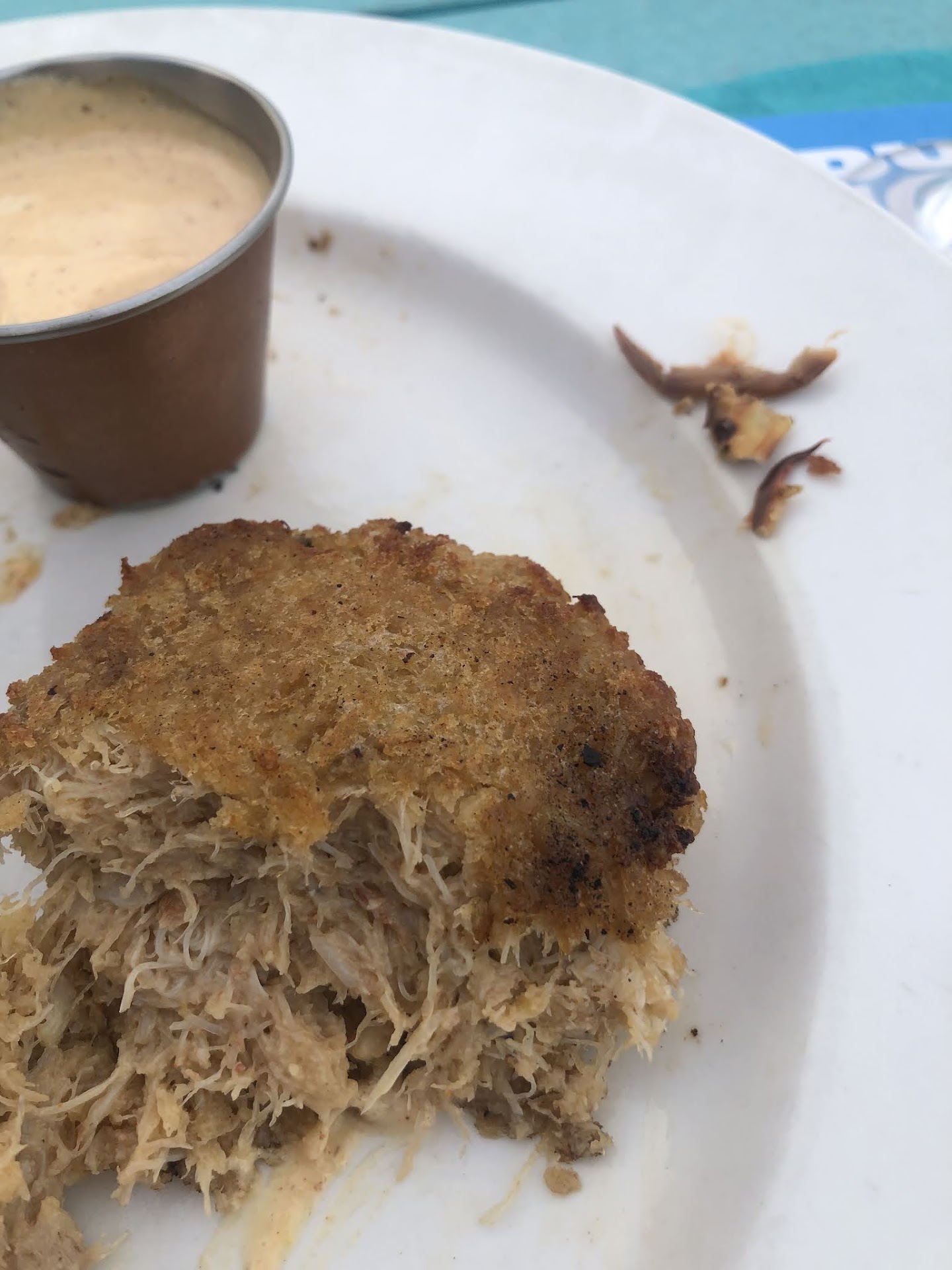 Now, for our experience there. The crab cakes were terrible. They were mealy, with shreds of crab (no lump crab meat), full of breadcrumb fillers and seemed to be pressed into a pan, then "cut out" with a spatula and fried. And, I found a crab leg and shell in my crab cake (see photo)! When my husband told the manager that, he said it was impossible. The macaroni and cheese was unseasoned and though my broccoli was overcooked it had nice flavor. The boom boom shrimp was just average, nothing special.