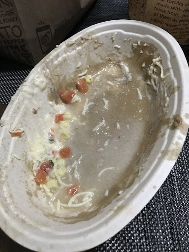 There was one female in particular working who was aloof to what was going on. She was trying to fulfill the mobile orders but “try” would be generous. She would sigh after every ingredient being added. She was straining looking at the order receipts figuring out what went on what. She grabbed a spoonful of sour cream for a salad bowl and apathetically dumped it on the bowl, having it run down and on to the counter at which point she just stared at what she did and then dragged the next burrito to her through it. She was over it, and no one was helping her- just her coworkers whispering into her ear and her walking away laughing. Again, where was the manager on duty?