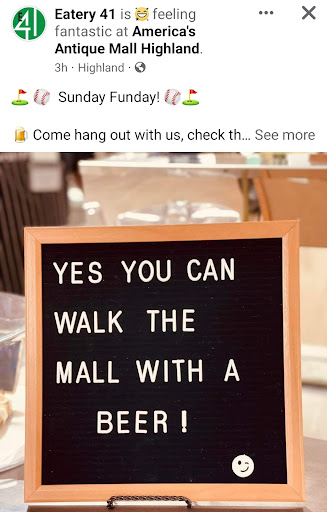 I ordered a $7.00 grilled cheese sandwich (when gas is almost $5) and it tasted really plain+not cooked all the way & the cheese wasnât melted and it was cold. My son ordered a $8.00 farmers salad with A root beer. Altogether we spent $19.05. Thatâs a lot of money for what we got. We shouldâve just got two $1 cheeseburgers with fries it wouldâve been better. I hesitated getting something but we were hungry or maybe desperate. Rod is the owner. Nice guy, but eatery 41 is overpriced and I felt I didnât get our almost $20 worth. I cannot recommend eatery 41. Save your money and eat before or after You go to antique Mall...