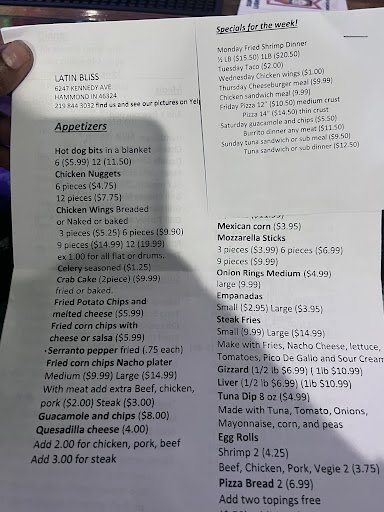 Read moreI went to Latin Bliss for the 1st time recently, and it was my last. The food was not that great, and it was ridiculously expensive, definitely not worth the price. While waiting for my order, an employee popped open a beer, came to sit by me, and was rambling on about jail, fights, and other things. I'm a nice person and was trying to be nice, but I was uncomfortable. Then he even followed me out when I was leaving. I was disappointed in the service, and my whole family was not happy...