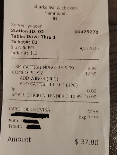 Ā Ā Ā Read moreI was hoping for a good experience from Sharks. I had been to the one in Merrillville. I was on my lunch and when we got there, there was only one person sitting a waiting for their order. A friend of mine and I walked in. We weren't sure of what to order, she ordered the chicken wing dinner and I ordered the crispy chicken sandwich with fries and drink. It started off where she got her unsweetened ice tea. Then I wanted to get the sweetened ice tea, it came out like water. So I mentioned it they said they had to check the machine. While waiting for someone to come I decided to get the orange drink instead. My friend got her meal first and it looked good. I had to wait for a while. After about 10 or 15 minutes, mine still wasn't there so I asked. The cashier asked about my order the guy looked like he didn't know. So I waited maybe 5 minutes more. When it came it wasn't hot. It seemed fine for the first couple of bites, when I bit into the center it was tough and rubbery. I took it back and told them. They asked what did I want. I said that I wanted another to go because I didn't have much time for my lunch. It took another 10 minutes then they asked me if I wanted cheese, well they didn't ask me that for the first one which had cheese. After getting the meal to go. I was expecting it to be hot and it wasn't. There was another couple who came in after us and got there meal quicker than mine. I won't be...