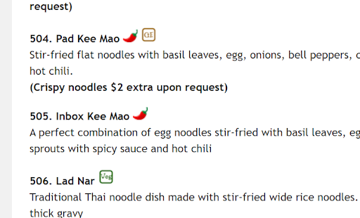 Read moreI have ordered here regularly for a few years. Recently, there has been a notable decline in the quality and service. This last order, we ordered the Pad Kee Mao (drunken noodles) Gluten free. This dish is typically made with wide Rice noodles and made gluten free. However, when picking up, we were told they did not use the wide rice noodles and used egg noodles. Which was odd, considering that is not how the dish is typically made and not gluten free. We ended up having to wait for them to make it with rice noodles and instead ended up with thin rice noodles, which is a totally different dish. They claimed that they do not make wide rice noodles, yet i have ordered dishes with them from here before and the menu still has wide rice noodles on it throughout. The cashier did not seem informed or willing to communicate with the chef or offer any compensations for the inconvenience. This was one of a few places I trusted when ordering GF, especially considering many Thai dishes are easily made GF, but they seem to be going through some changes and lately the service has been short, rude, and unhelpful so I can't recommend them...