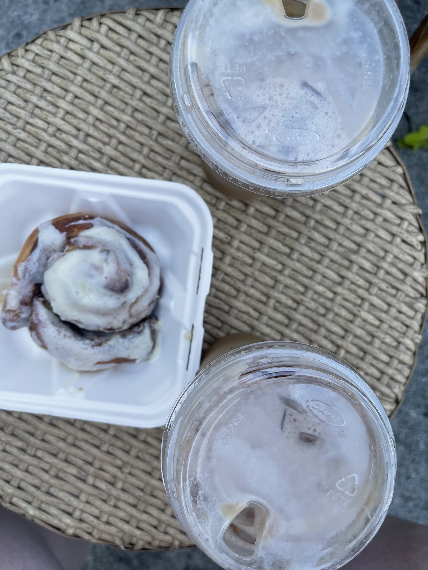 Iced coffee bucket, regular coffee, and Cinnabon were amazing! Some do the best coffee I ever had and Cinnabon was perfectly made, not too sweet and just the right touch of cinnamon and sugar and cream cheese frosting.