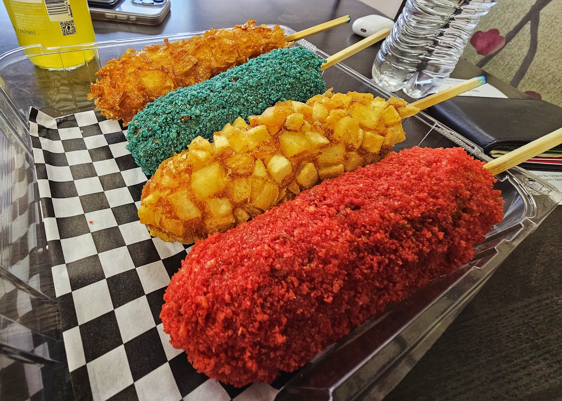 Awesome little place!! So glad to get mochi donuts and Korean corn dogs in this side of town!! Cool little dining room with a nice little spot for pictures or selfies. They offer korean corn dogs, mochi donuts and boba teas. Didn't try the donuts this time but did have the Korean Corn Dogs. The people working there were very nice and helpful when telling us about their items. We got 4 corn dogs and 2 drinks and the bill was about $35. About $6.50 for a corn dog with a topping. We tried 2 classic and mozzarella dogs and 2 classic and cheddar dogs. We got the hot cheetos, blue takis, crunchy cereal and potato toppings. The potato and cereal toppings were the best! They had a great crunch that really added to the experience! The blue Taki topping was very good as well, not crunchy but very good flavor. The Hot Cheeto was alright. The taki/cheeto toppings don't get crunchy which is a little odd. But they were still good! They also have about 10 different sauces that you can use as well! The mochi donut flavors they had were: Carmel churro sea salt, Matcha, Strawberry funnel, Whipped chocolate, Fruity pebble, Original, Banana cream, White chocolate swirl, Cherry I definitely recommend and will definitely be back soon to try...