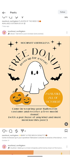 Read moreLove the mochinuts here! But if you advertise a free donut with any purchase if wearing a costume and then at the register say it's $10 purchase minimum it can put a sour taste in your mouth not to want to come back. The post didn't state there was a minimum purchase amount. I attached the post for proof. I definitely had an Olive Oyl costume on. From the cartoon Popeye, sour taste still there after arguing back to a valid review. I also came in today Friday which isn't included in your happy hour. Your happy hour is...