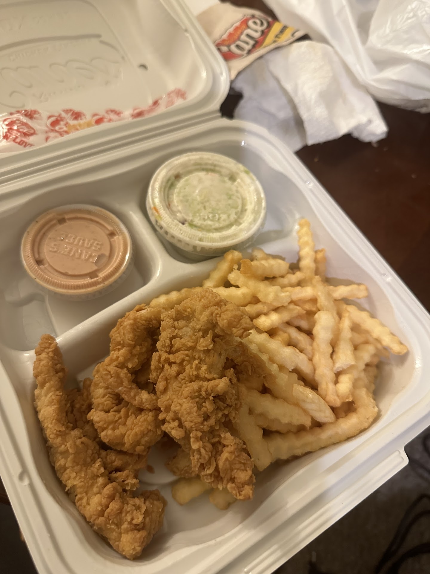 Read moreAlthough I love Cane’s, I had multiple bad experiences in this location. The service is just horrible. After two times before having either very little fries in my order, or very tiny chicken fingers (much smaller than what they have normally), yesterday I had an order that had some tiny chicken fingers and missing the bread. I decided to drive back to let them know how the order came and it is missing bread. The girl’s response (not sure if she is the manager but she was wearing green/blue shirt) was really unprofessional, she just said I will give you a bread that is all I can do. I definitely refused that and told her that is totally unacceptable and that I had to drive back again because of their mistake not having bread on top of having tiny chicken and now my meal is cold. She still said she can only provide a bread. I got pissed and told her calmly I ordered a hot meal so I need a normal hot meal with the bread, and she eventually gave me what I asked. I don’t think I will get cane’s again from this location given the deteriorating quality and the horrible service. So...