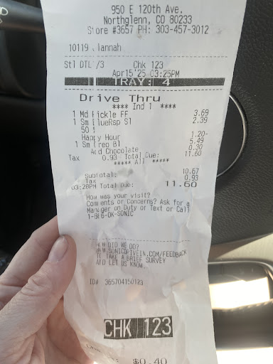 Read moreBeen a long time customer of Sonic. From Texas to Colorado. Many locations in Colorado. Last 3 times I've been to this location... complete dysfunction! In the 10 minutes that I waited to place my order at the walk up window on my visit just now, my daughter and I witnessed the following: